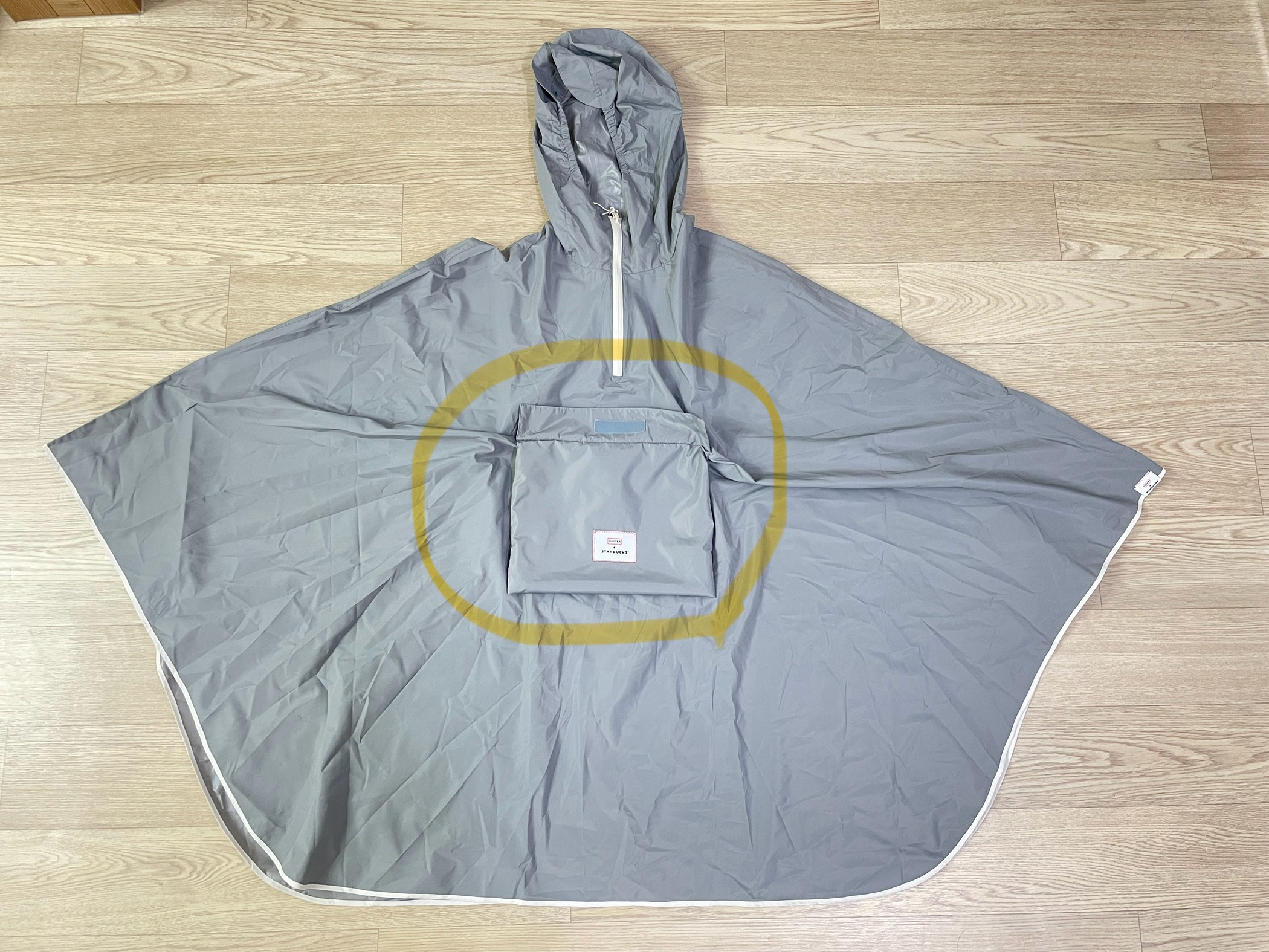 처음에 아무렇게나 접었더니 이런 모습으로 됩니다. 약간 뚱뚱하게 접혀서 처음 받았을 때의 콤팩트함은 없었습니다. 그래서 다시 펼쳐서 예쁘게 접으면서 사진으로 남겨보았습니다. 앞으로 스타벅스 판초 접는법이 기억나지 않으면 이 글을 보고 따라 하시면 되겠습니다.