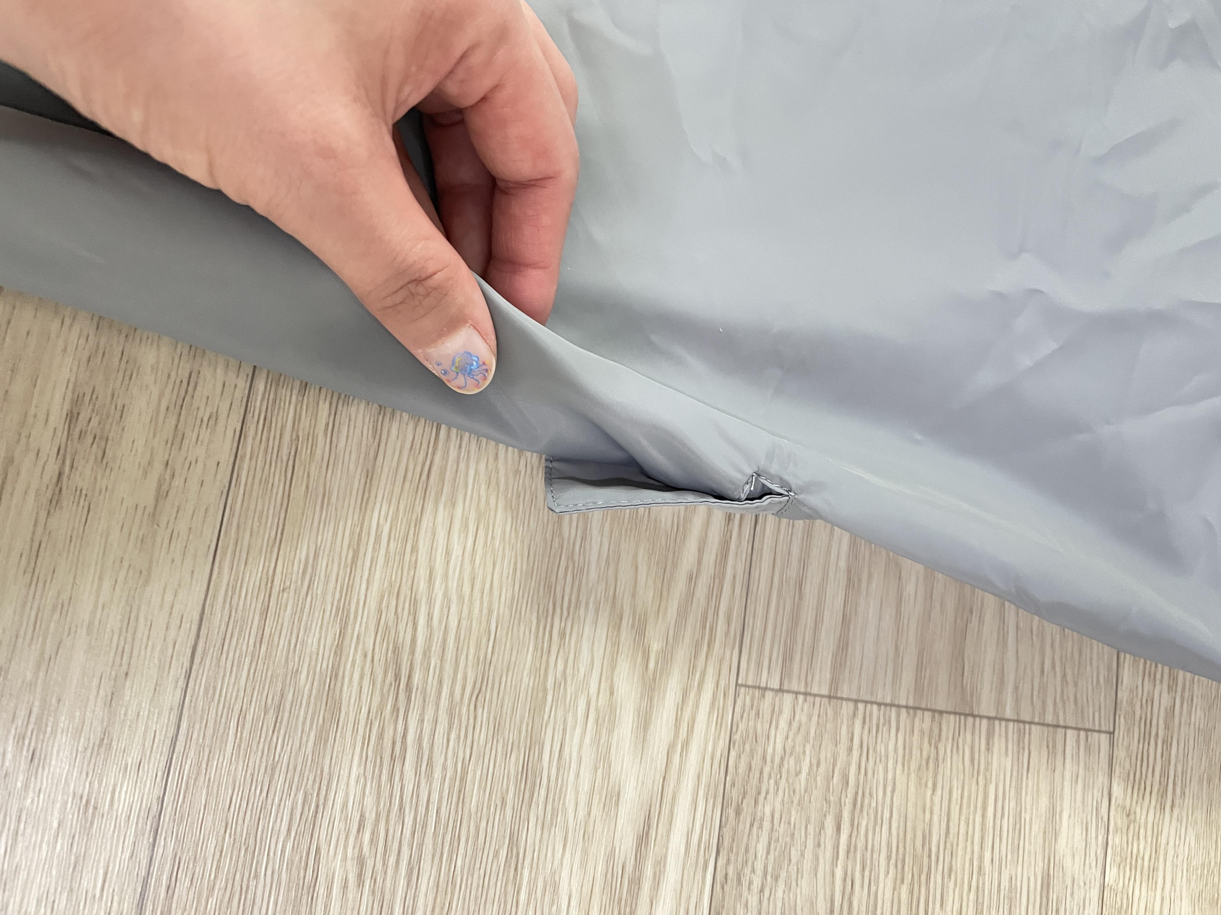 1. 우의를 바닥에 놓고 넓게 펼친 후 가운데 포켓은 로고가 드러나지 않도록 안으로 넣어줍니다. 아래 사진을 보시면 왼쪽 사진에서 노란색 동그라미 부분처럼 로고가 보이면 안 되고 오른쪽 사진처럼 안쪽으로 로고 부분이 들어가야 합니다.