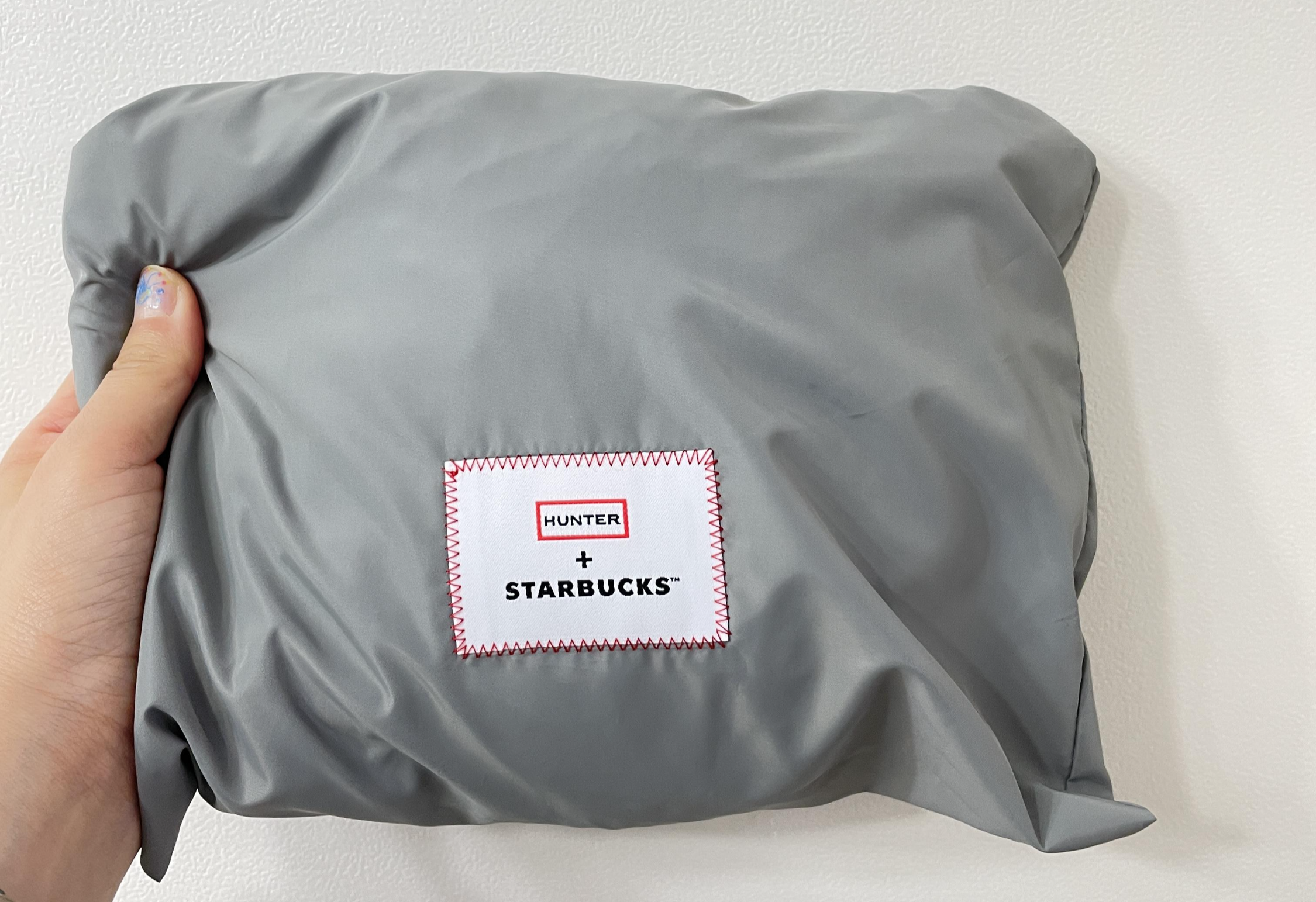 7. 위의 사진처럼 되었다면 주머니 부분에 손을 넣어 접어 놓은 판초를 뒤집어 줍니다. 뒤집어 주면 아까 맨 처음 보였던 스타벅스와 Hunter의 로고가 보일 것입니다. 주머니 안에 판초가 쏙 담겼다면 이제 모양만 잡아주면 됩니다. 모양을 예쁘게 잡아준 후 찍찍이로 주머니를 고정해 주면 스타벅스 판초 접는법 끝입니다!