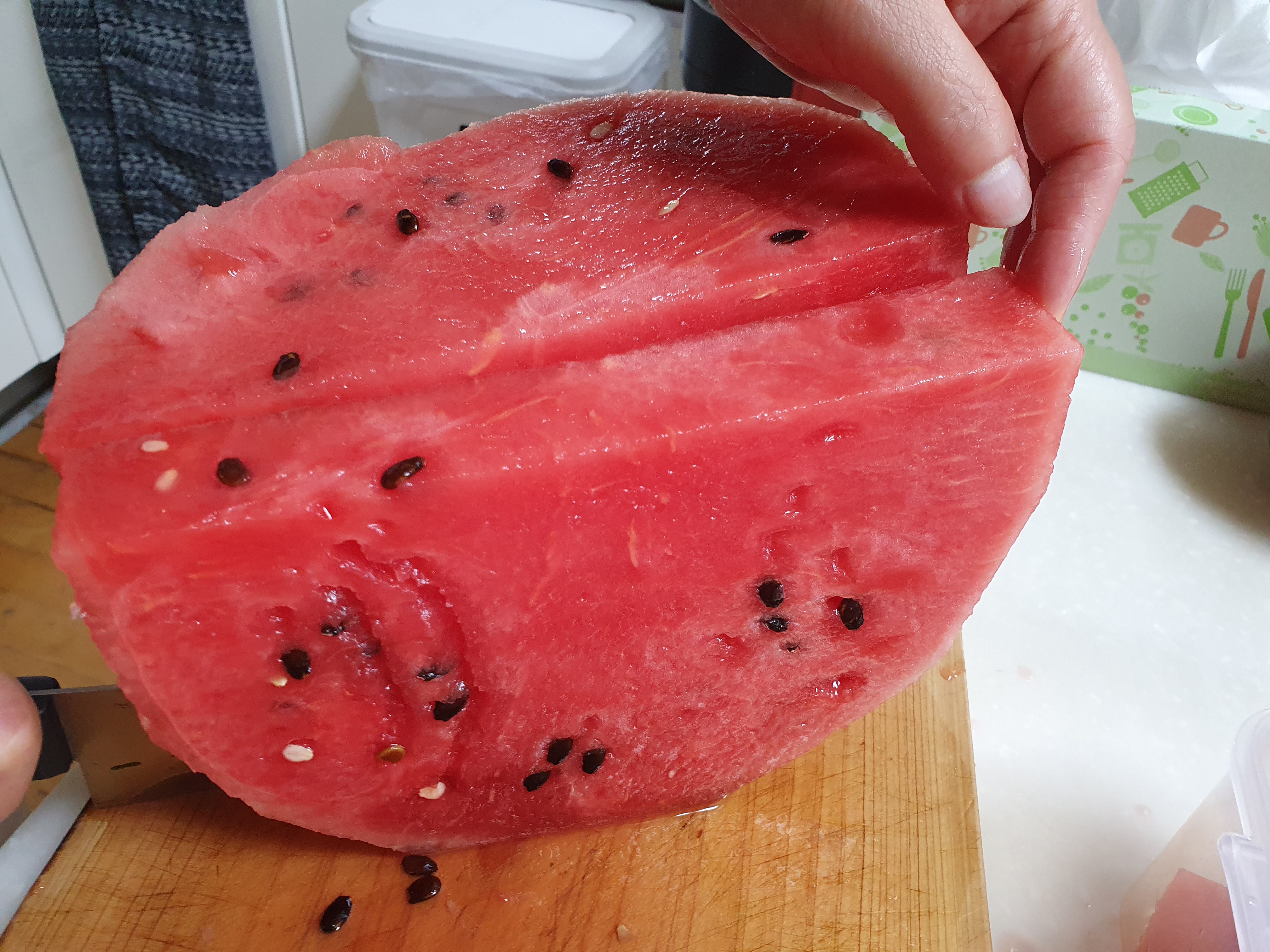 겉과 속이 이정도면 잘 산 것 같아요. 한 조각 썰자마자 한 입 먹어봤는데, 꿀수박입니다. 처음 인터넷으로 수박을 사보는건데 실패하지 않아서 다행이에요. 아니 완전 성공적입니다! 씨도 많은 편은 아닌 것 같아요.
