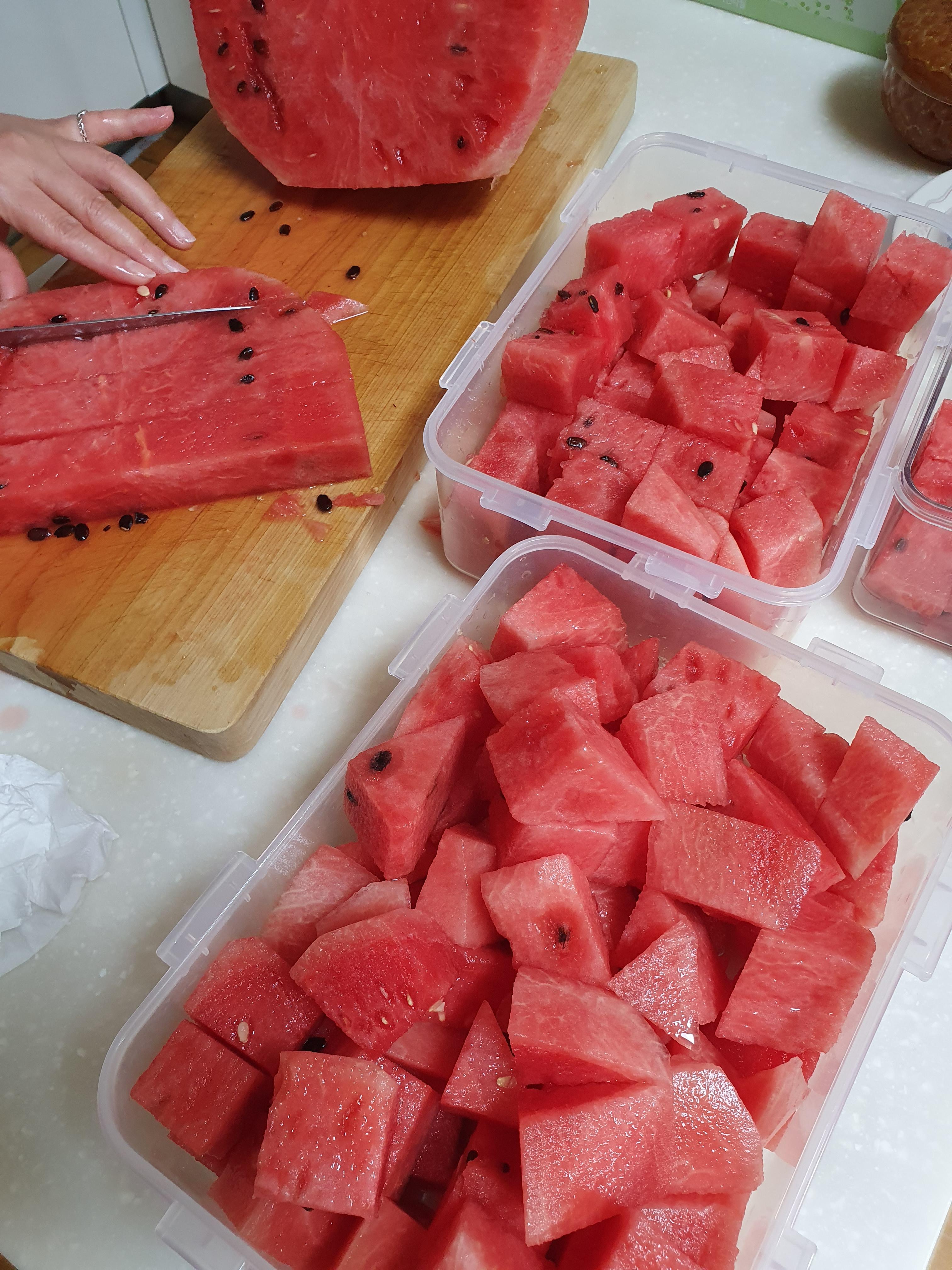 사진에서 보시는 것처럼 깍둑썰기로 수박을 자르면 밀폐용기에 요로코롬 보관하기가 수월해요. 냉장고에 자리도 많이 차지하지 않고, 특히나 나들이갈 때, 간편하게 들고가기 편리하죠?