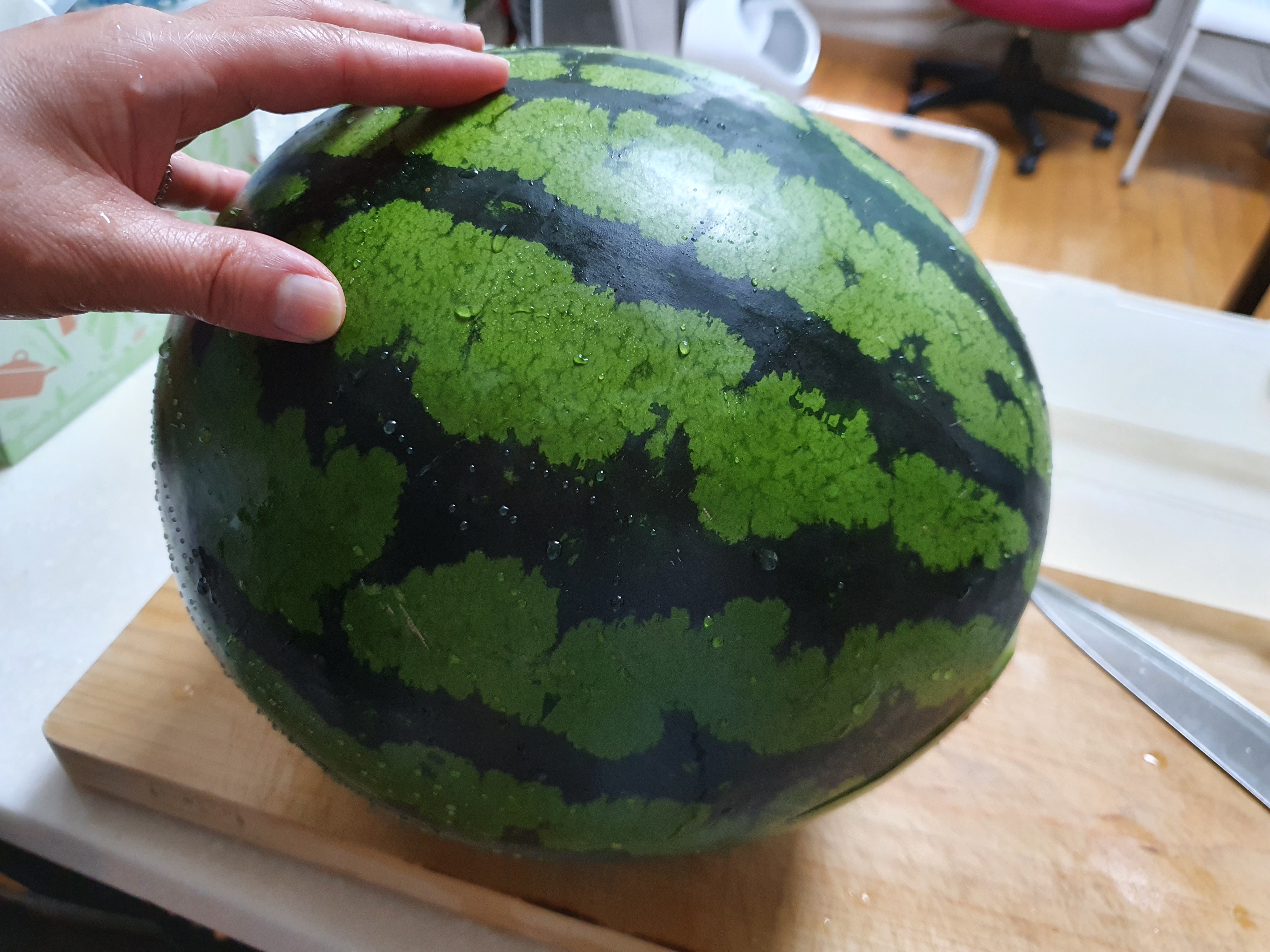 배송박스에서 꺼내자마자 자를 준비 완료! 겉으로 보기에 굉장히 신선해 보이네요. 그럼 한 번 잘라서 속을 살펴봐야겠죠? 수박은 겉보다 속이 더 중요하니까요!
