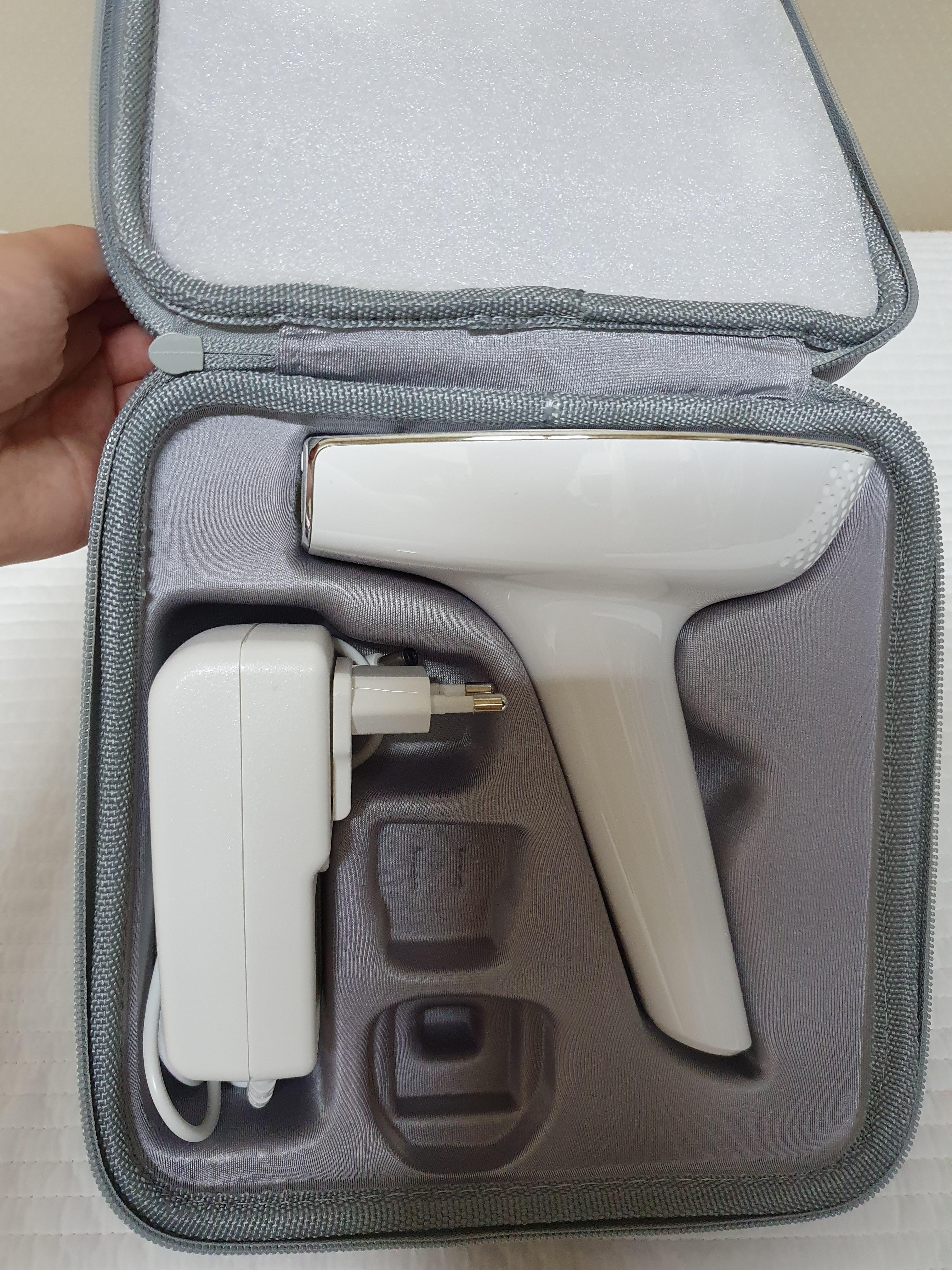 박스를 뜯으면 이렇게 제모기를 보관할 수 있는 전용 박스가 들어있어요. 내부에는 본체, 전원연결선, 사용설명서, 레이저 출력부를 닦는 헝겊이 들어 있어요.