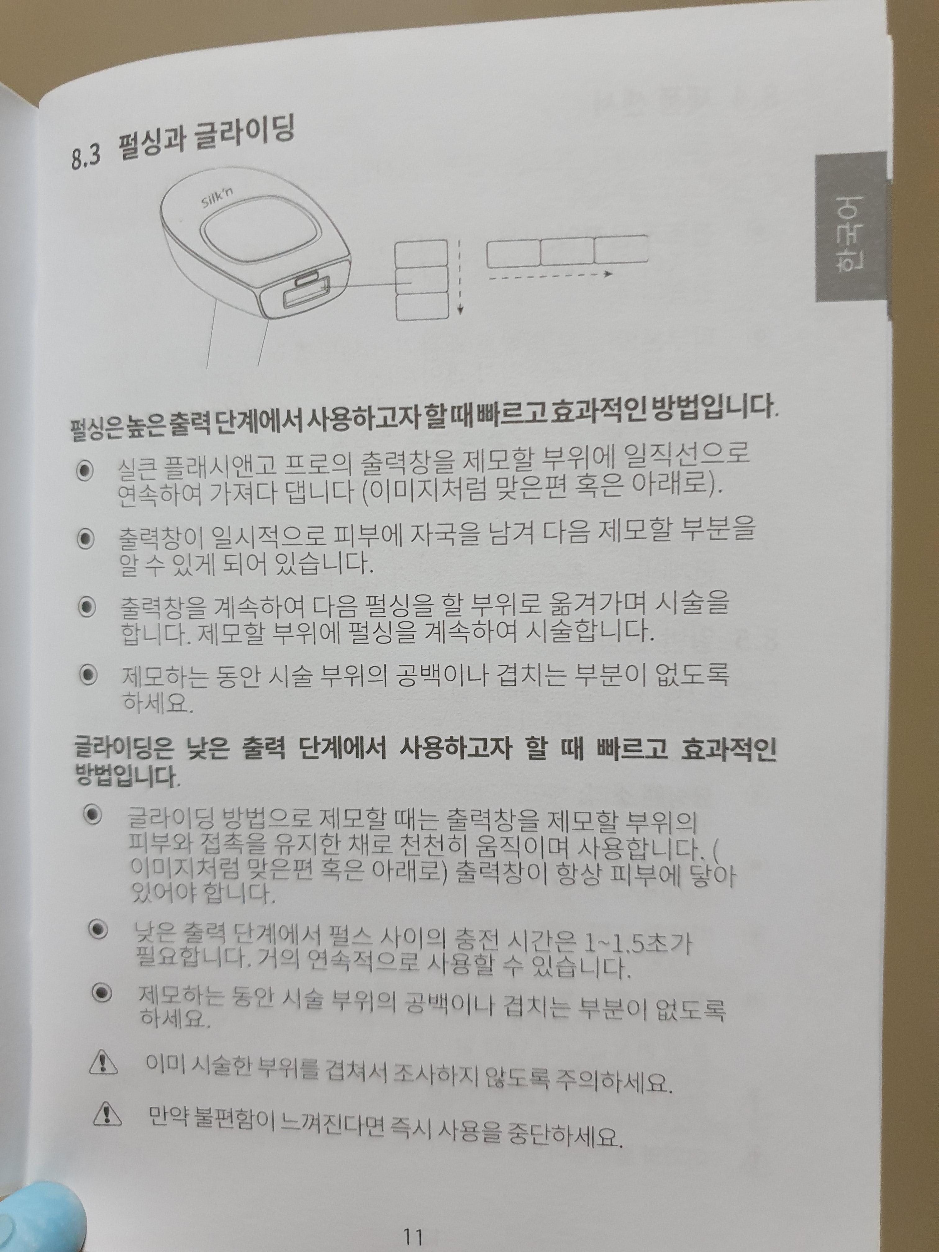 저는 부위별로 강도를 조금씩 다르게 하는데, 팔은 3단계, 다리는 4단계로 해요. 친구 빌려줬더니 인중 제모를 했다고 하더라구요. 인중 제모는 따가울까봐 무서워서 2단계로 했는데 괜찮았다고 해요.