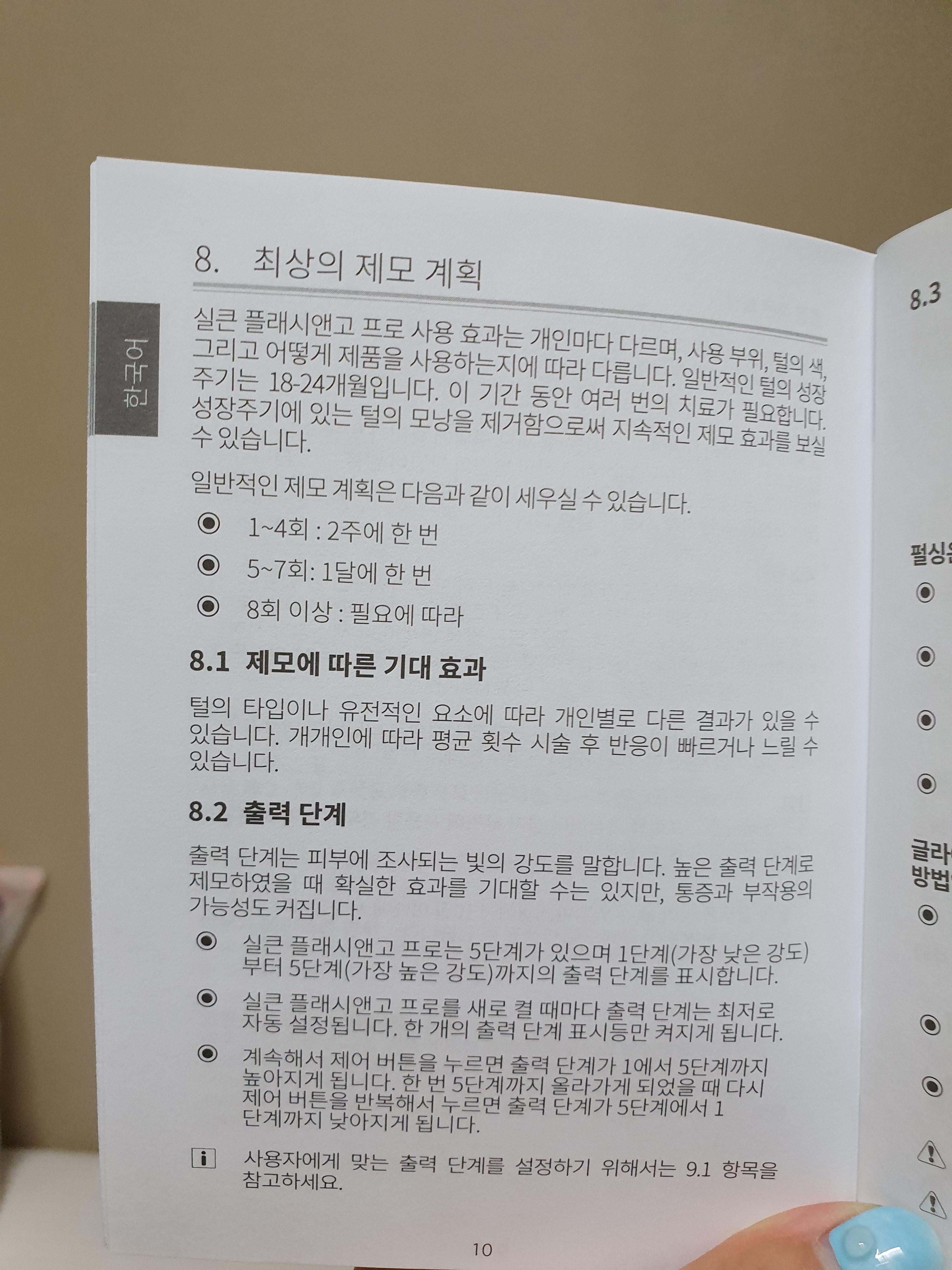 제일 궁금했던 제모계획까지 알려주는데요, 4회차까지는 2주에 한 번, 그 이후는 한 달에 한 번 사용으로 권고하네요. 현재 저는 한 달에 한 번 사용하고 있는데 이제 조금씩 효과가 나타나는 것 같아요.