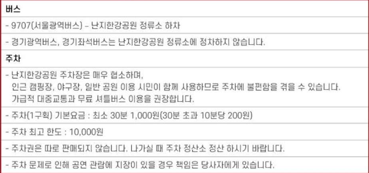 난지 한강공원 공연장 가는 방법은 다음과 같습니다. 주차장은 협소하고 주차비도 저렴한 편은 아니기 때문에 자차를 가지고 가시는 것보다는 대중교통을 이용하는 것이 좋습니다. 무엇보다 6호선 월드컵경기장역에서 난지한강공원 입구까지 무료 셔틀버스를 운행하기 때문에 편리하게 이용 가능합니다.