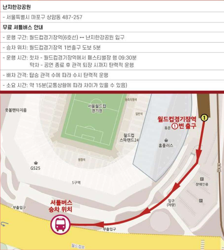 난지 한강공원 공연장 가는 방법은 다음과 같습니다. 주차장은 협소하고 주차비도 저렴한 편은 아니기 때문에 자차를 가지고 가시는 것보다는 대중교통을 이용하는 것이 좋습니다. 무엇보다 6호선 월드컵경기장역에서 난지한강공원 입구까지 무료 셔틀버스를 운행하기 때문에 편리하게 이용 가능합니다.