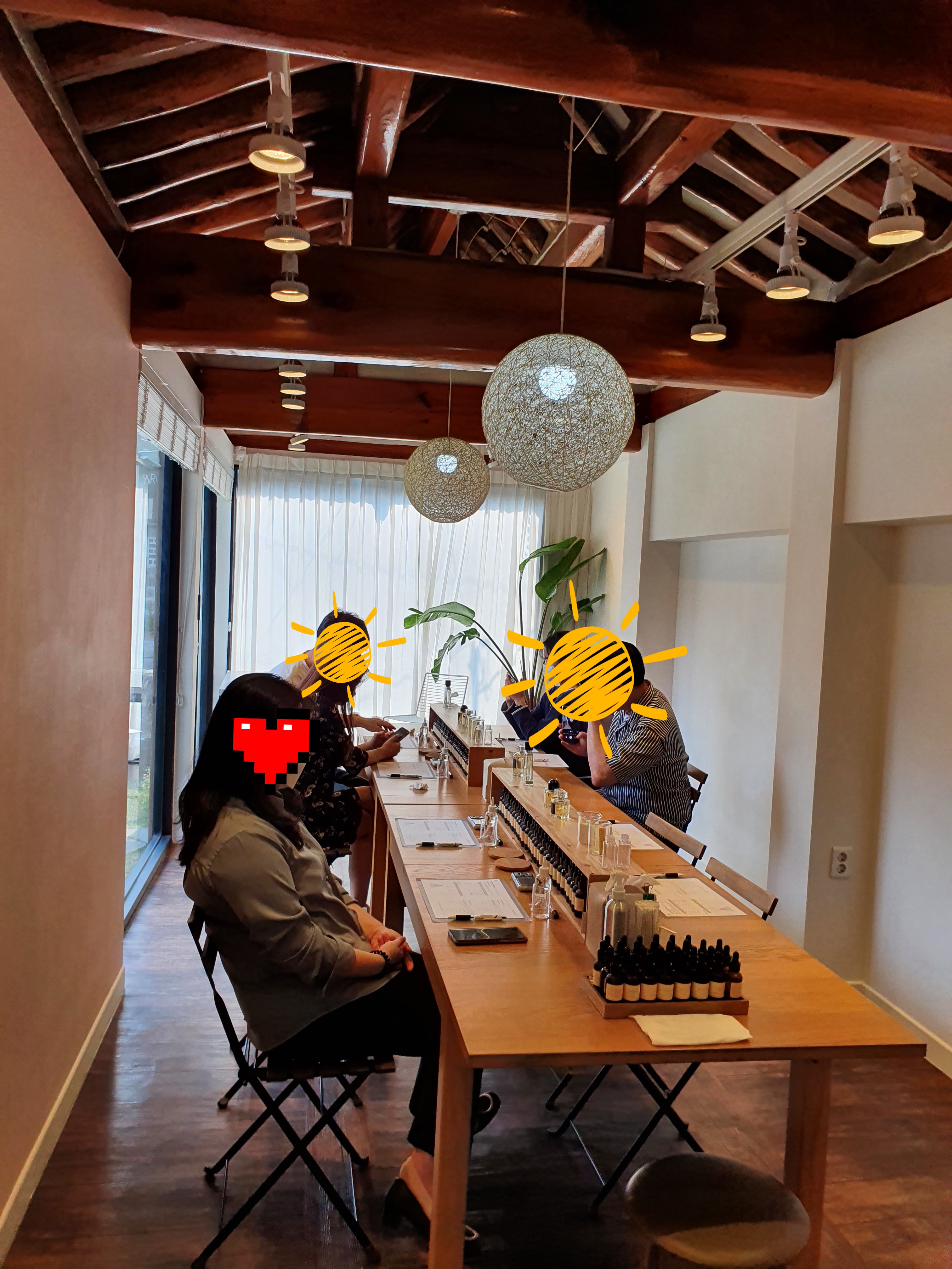 총 8명이 앉을 수 있고 오늘은 8명 꽉채워서 클래스가 시작되었어요. 자리에 앉으면 한 사람 당 펜 한 자루와 유인물이 놓여져 있는걸 보실 수가 있는데요, 유인물은 향수에 대한 기본적인 상식이 적혀있고 수업이 시작되면 선생님께서 차근차근 설명해주세요. 그리고 전자저울, 비커, 깔때기, 알코올, 여러 아로마 오일들이 준비되어 있어요.