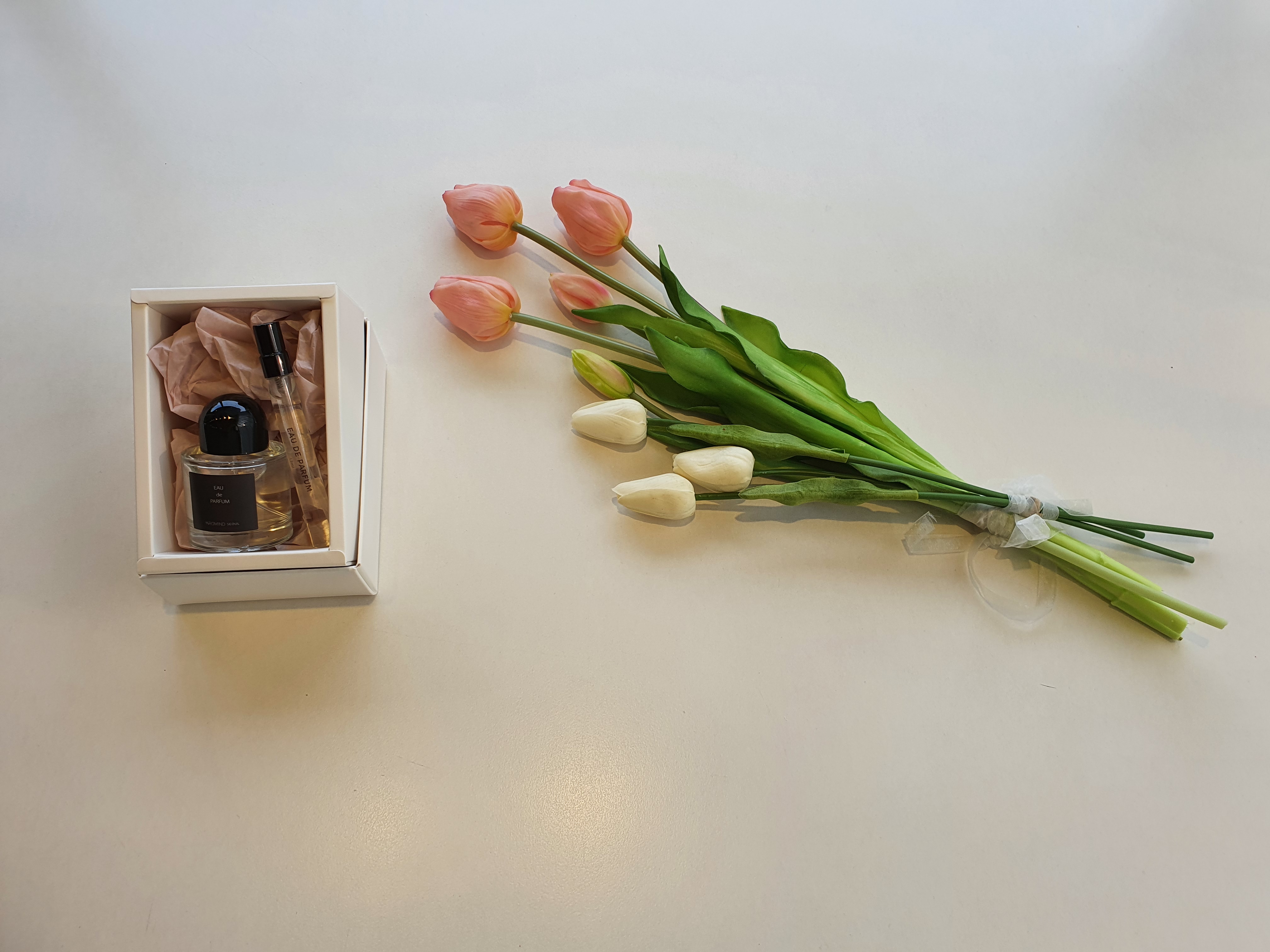 짠~ 포토존에서 예쁜 튤립이랑 인증샷을 남겨봅니다. 50ml 본품과 12ml 샘플을 박스에 담으니 백화점에서 파는 향수같아요! 500% 만족♡