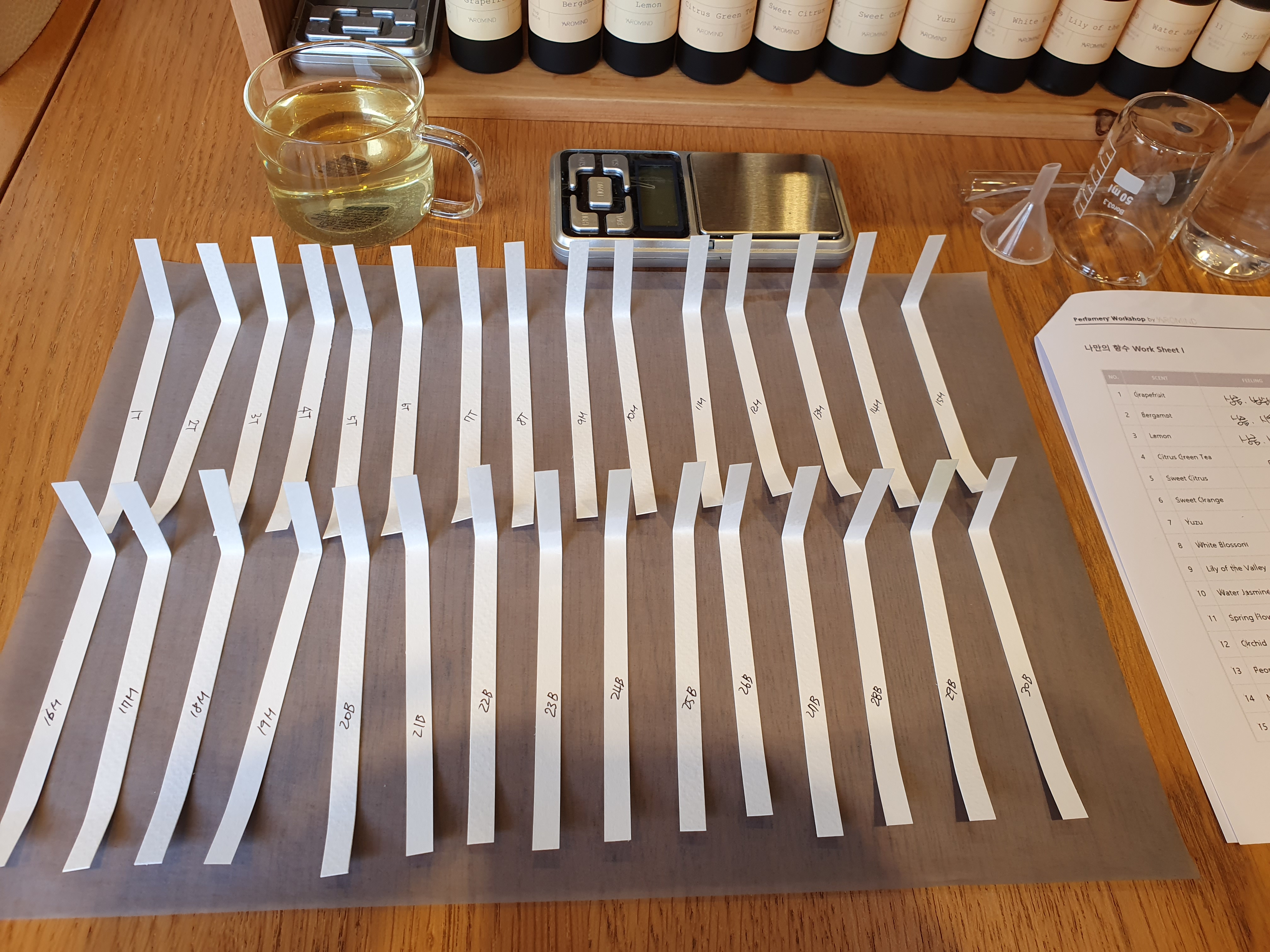 예약된 시간에 맞춰 클래스가 시작이 됐어요. 향수의 분류 방법과 노트에 대해 설명해주시고 top, middle, base 총 30가지 향의 시향을 하게 됩니다. 각각의 향이 헷갈리지 않도록 시향지에 번호와 알파벳을 쓰셔야 해요. 30가지의 향을 맡다보면 후각이 둔해져서 선생님께서 나눠주시는 유칼립투스 오일을 묻힌 화장솜을 중간중간에 맡아줘야해요.