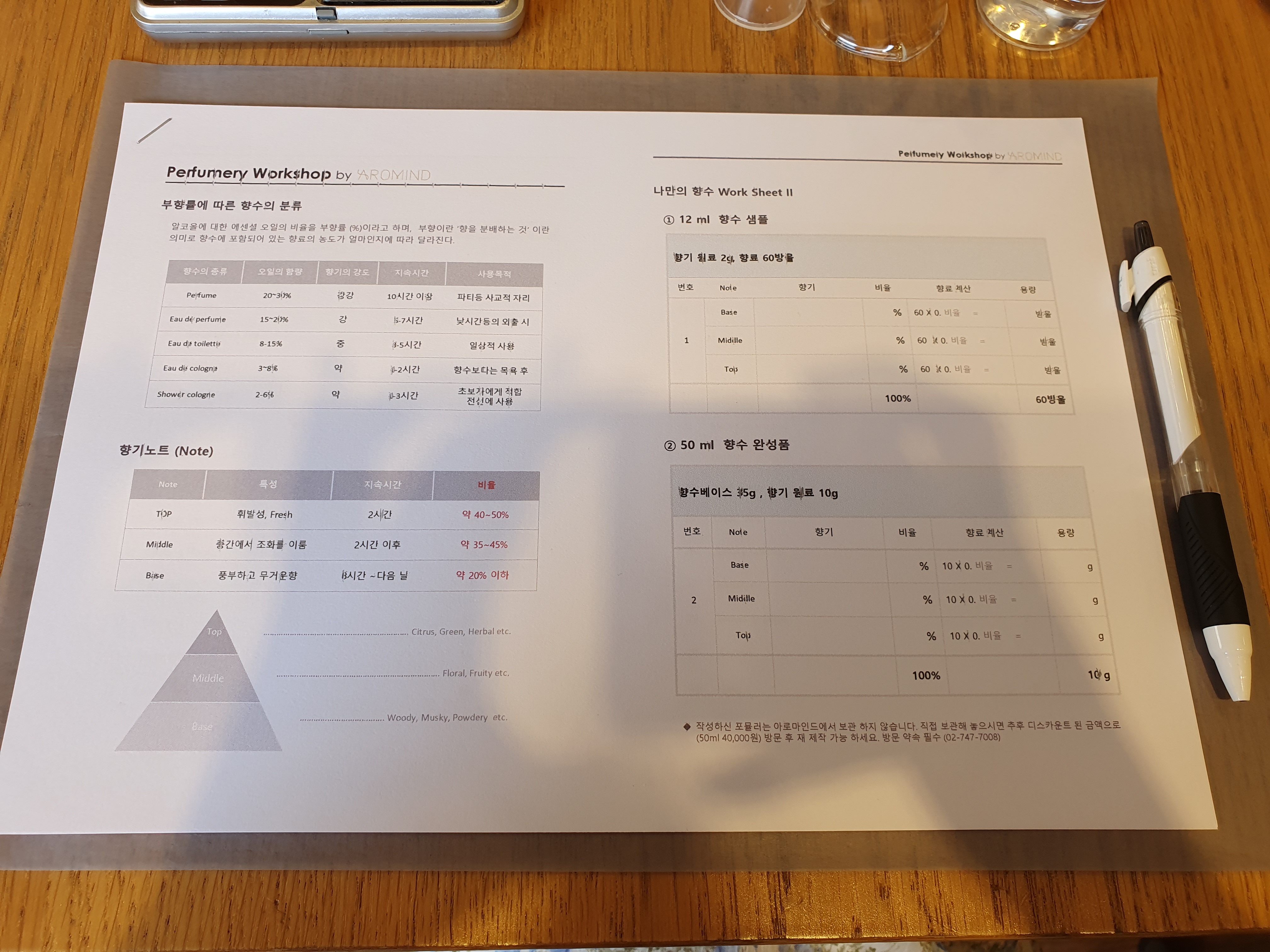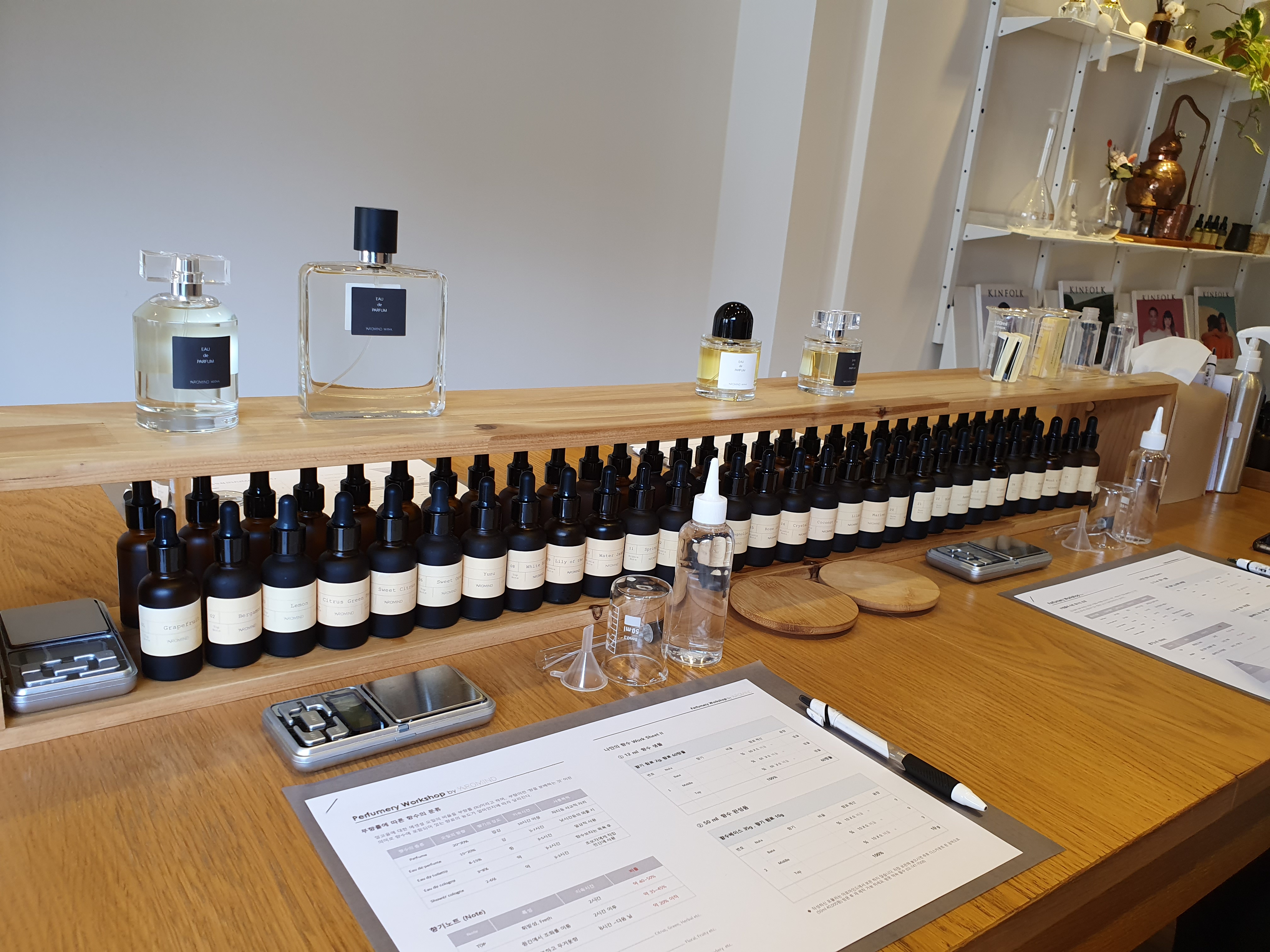 총 8명이 앉을 수 있고 오늘은 8명 꽉채워서 클래스가 시작되었어요. 자리에 앉으면 한 사람 당 펜 한 자루와 유인물이 놓여져 있는걸 보실 수가 있는데요, 유인물은 향수에 대한 기본적인 상식이 적혀있고 수업이 시작되면 선생님께서 차근차근 설명해주세요. 그리고 전자저울, 비커, 깔때기, 알코올, 여러 아로마 오일들이 준비되어 있어요.