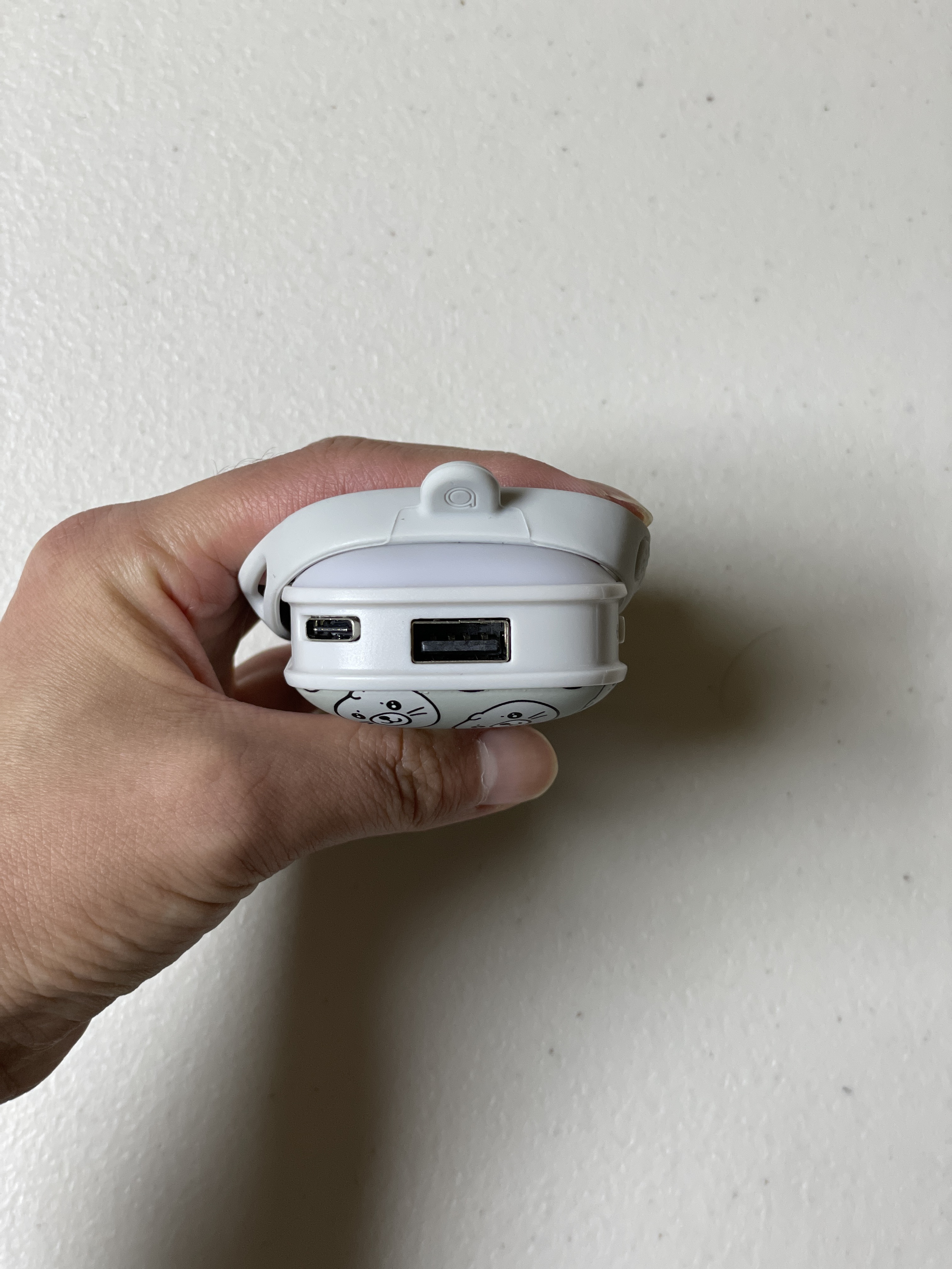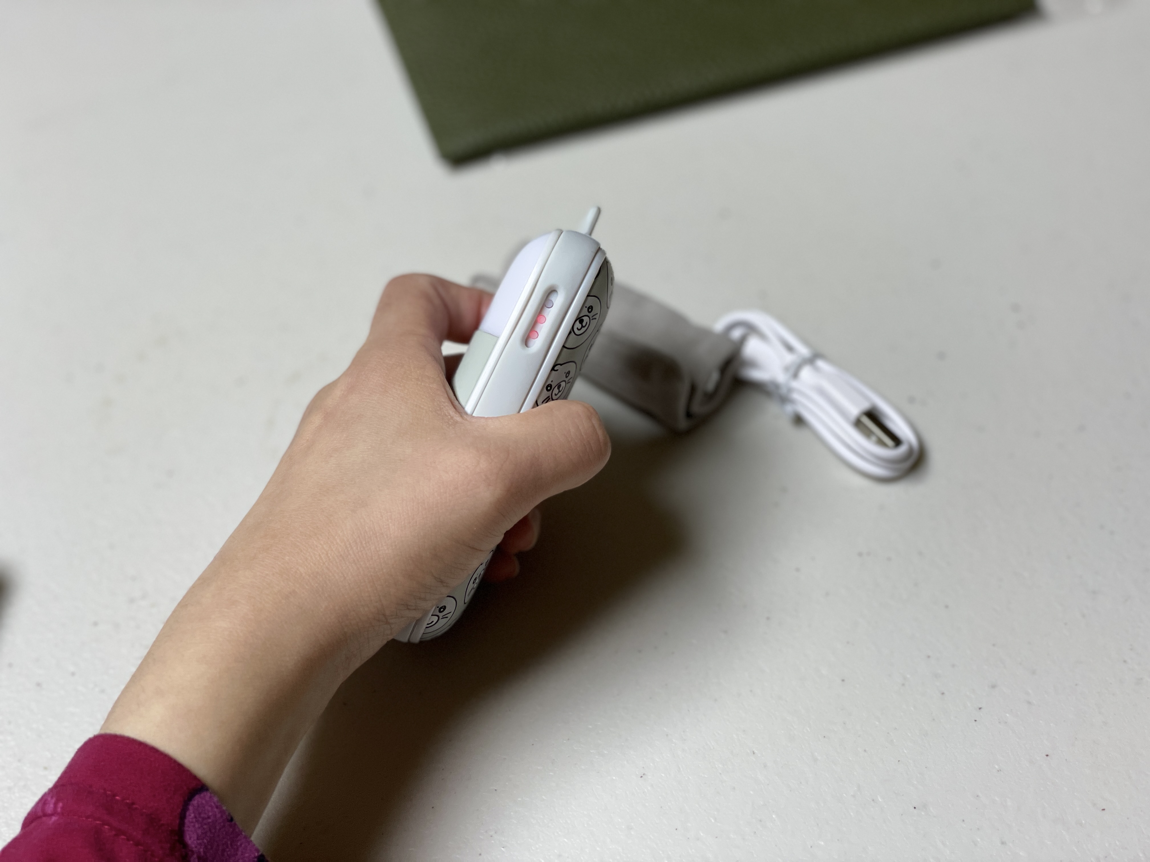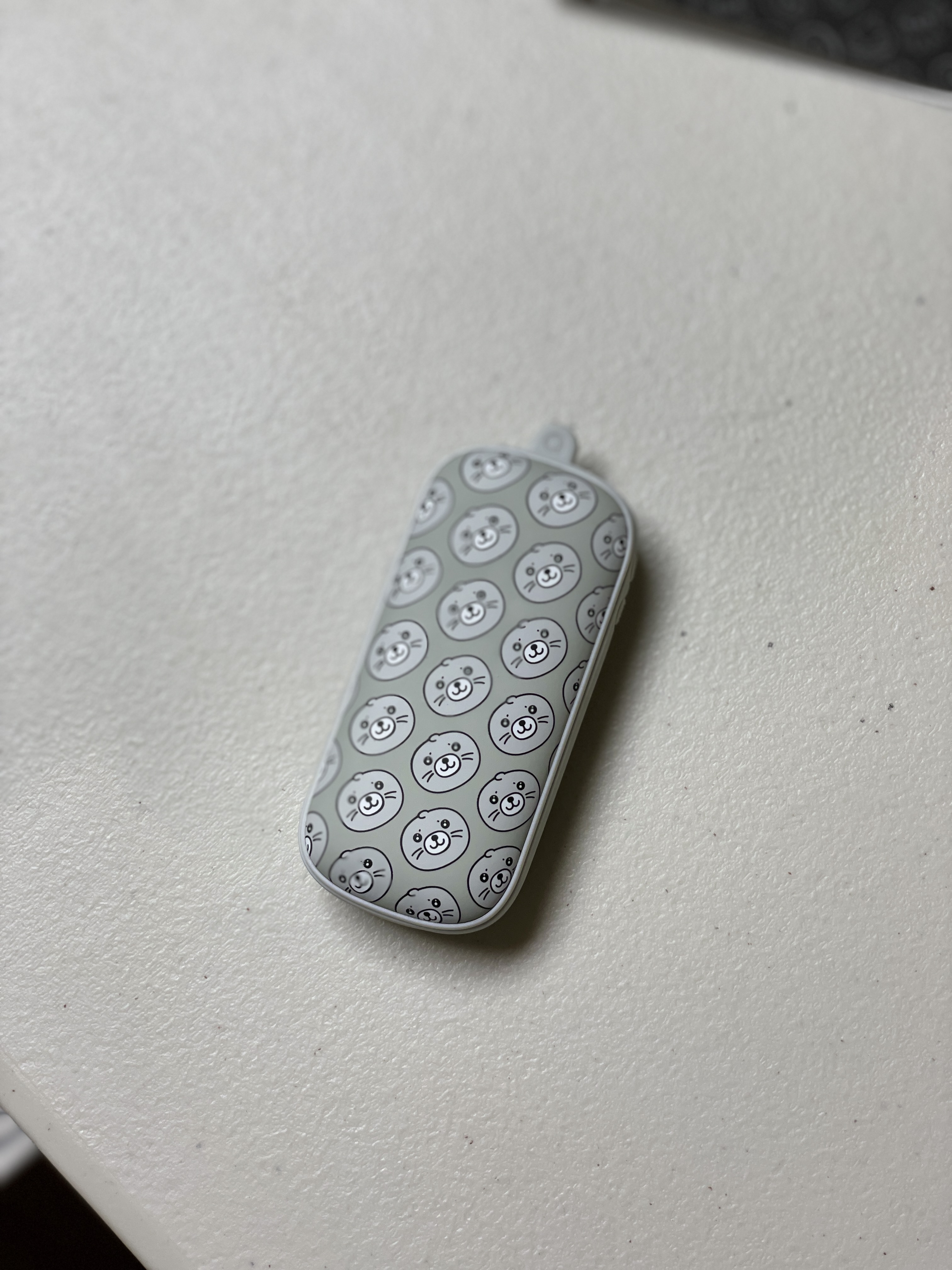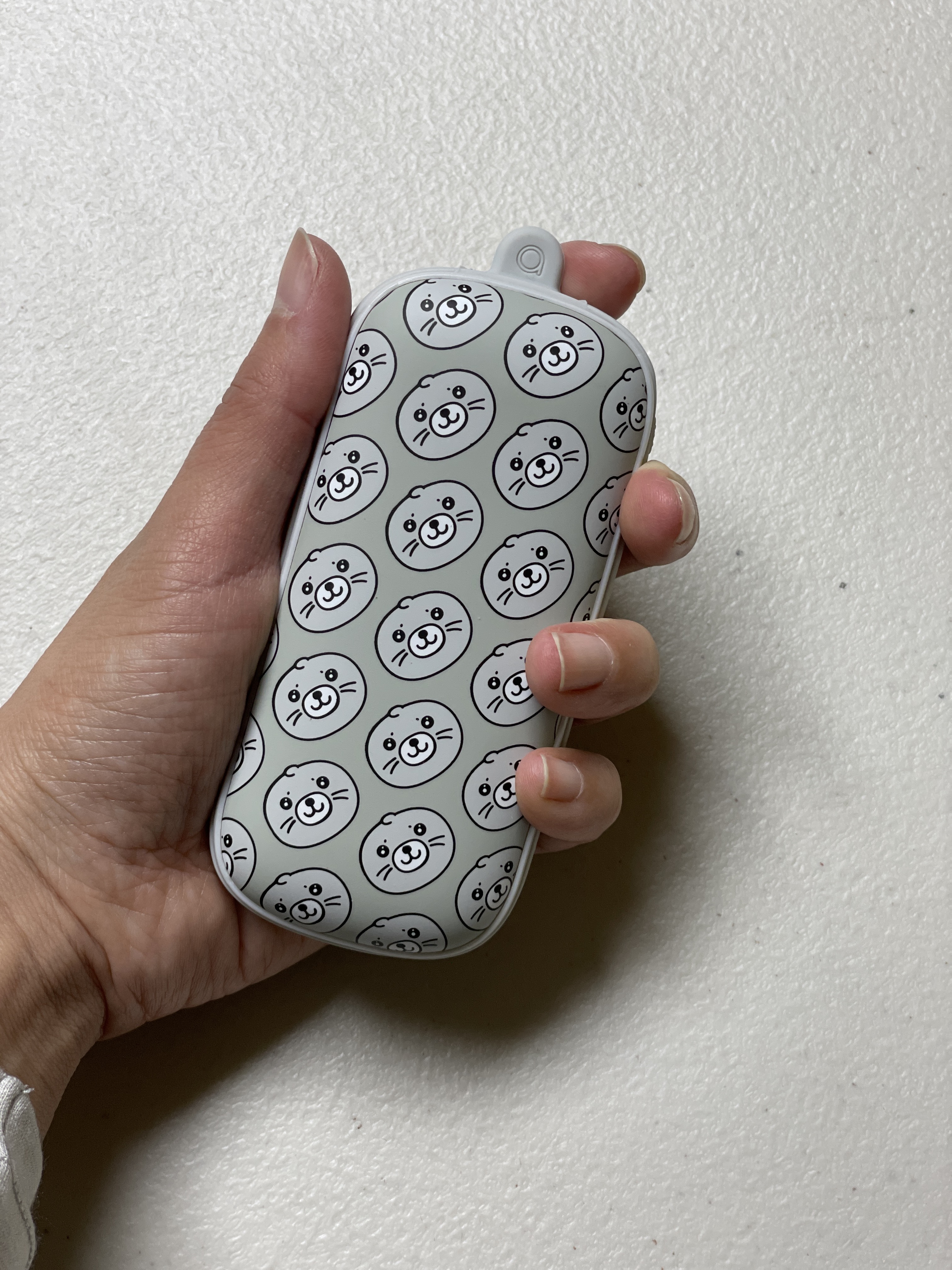 물범 디자인이 제 생각엔 제일 깔끔하고 귀여워서 이 디자인으로 선택했어요. 크기가 가장 궁금하실텐데 한 손으로 쥐었을 때 착 감기는 크기이고 그립감이 좋아요. 겉부분이 무광코팅으로 되어 있어서 부들부들합니다. 무게는 150g정도인데 배터리용량이 5200mAh라는걸 감안하면 괜찮은 무게입니다. 물범이 그려진 부분 전체가 발열판이라 발열판의 면적이 굉장히 넓습니다.