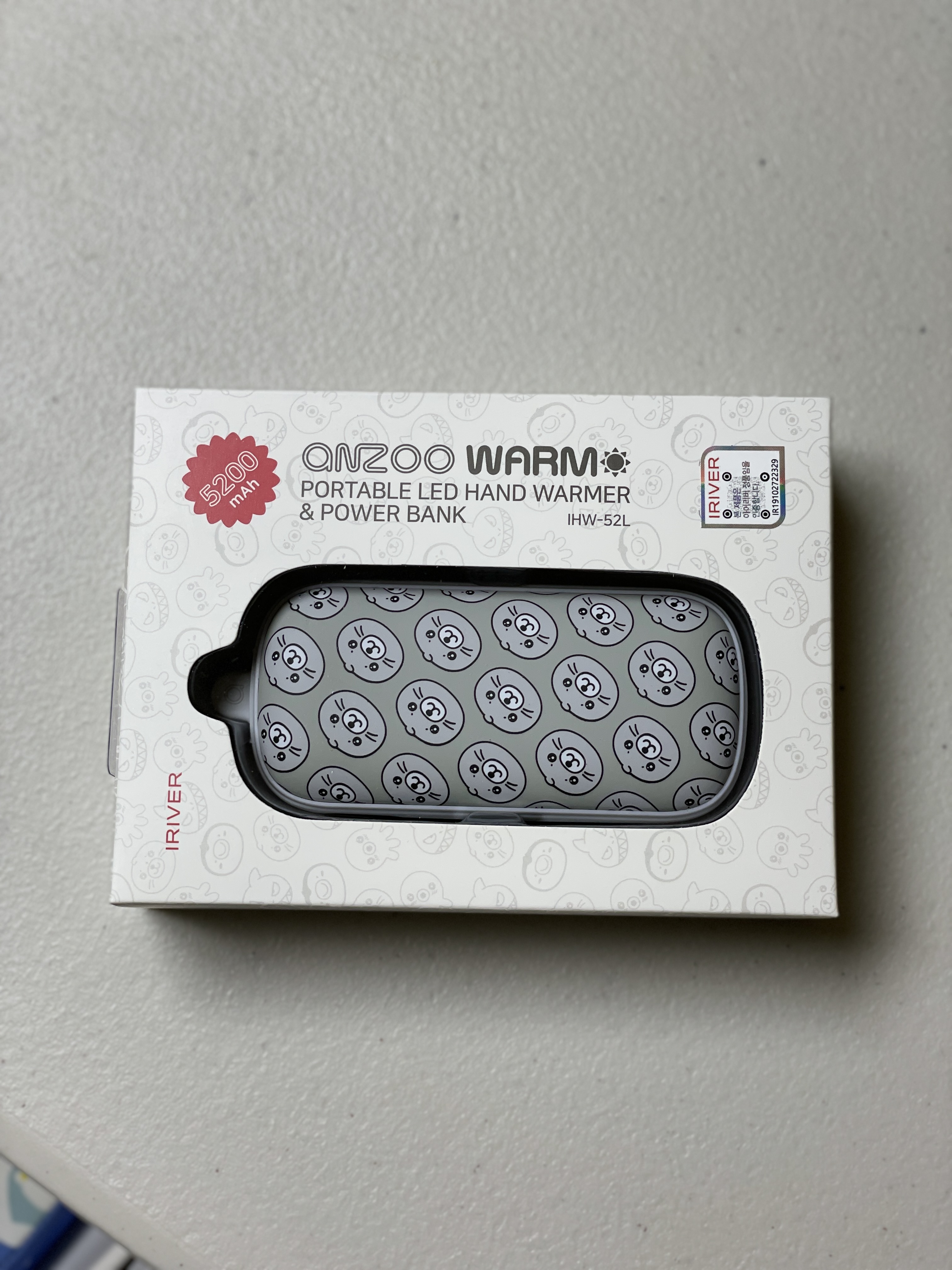 아이리버 충전식 손난로를 구매하면 이런식으로 박스에 포장되어 있습니다. 제가 선택한 디자인은 물범디자인인데 그 밖에도 펭귄이나 문어, 상어 디자인도 있어서 개인의 취향에 따라 선택하시면 됩니다.