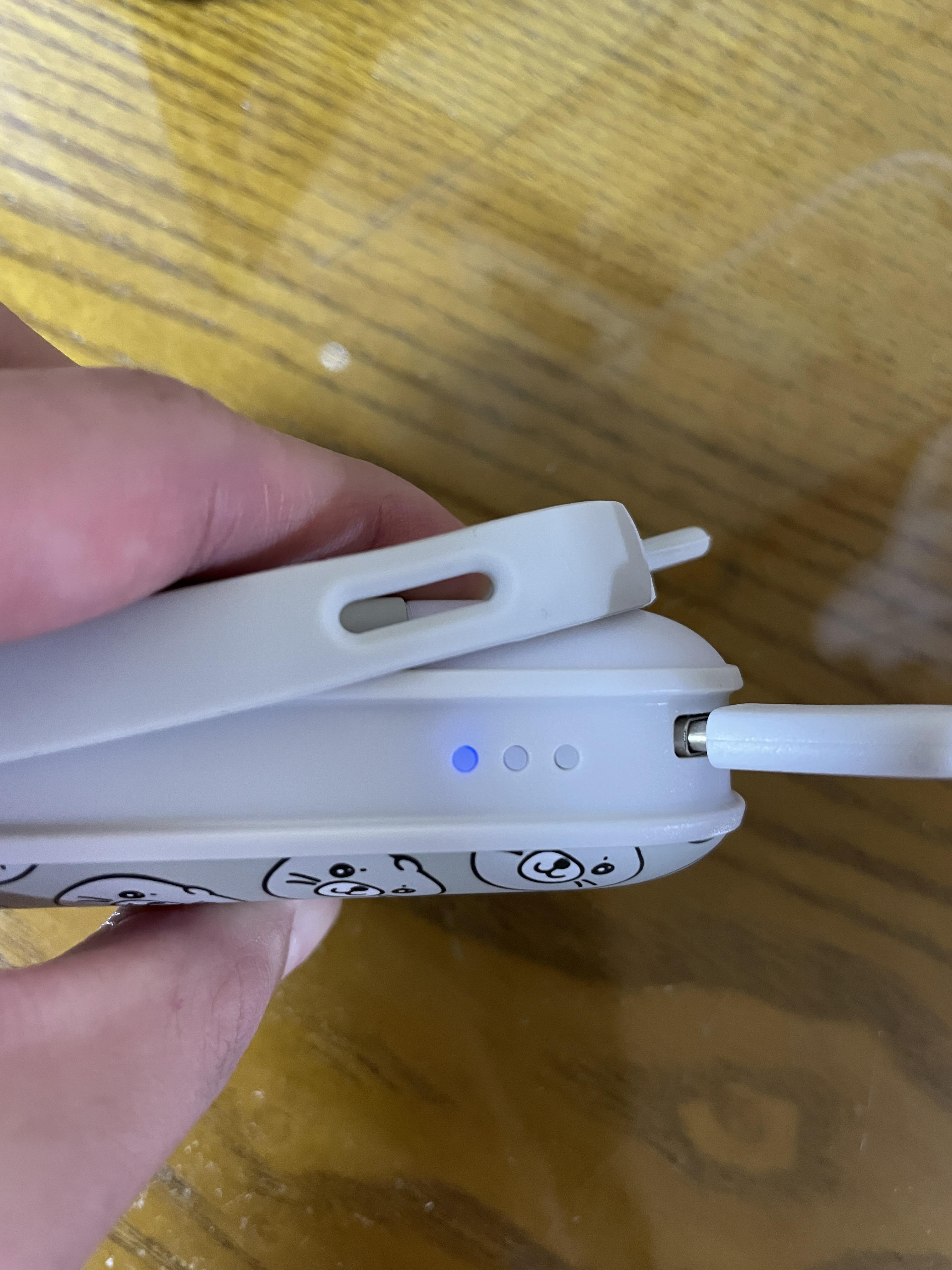 그리고 실리콘링을 벗겨내면 충전단자가 나오는데 보시는 것과 같이 C타입 단자라서 기존에 스마트폰 충전할 때 쓰는 충전기로 충전할 수 있어 편리해요. 또, 보조배터리로 사용할 때는 USB포트에 케이블을 껴서 휴대폰과 연결해서 사용할 수 있습니다. 배터리 잔량은 파란색 불빛으로 확인할 수 있는데 잔량을 3단계로 확인할 수 있어서 필요 시 충전하면 됩니다.