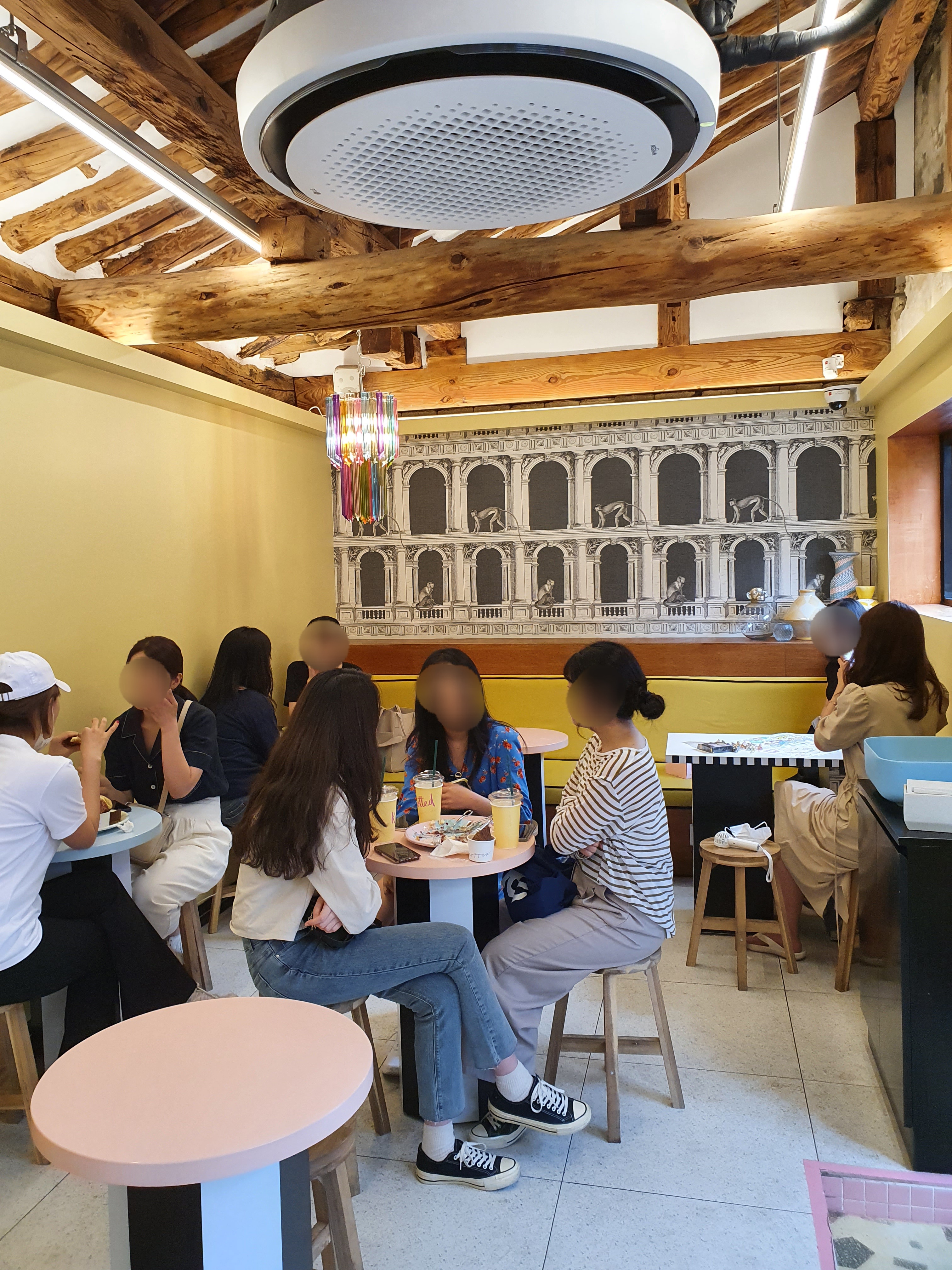 입간판을 보고 골목으로 쏙 들어오면 이런 귀여운 카페가 하나 보이는데 여기가 바로 노티드입니다! 이런 느낌의 카페 미국에서 본 것 같기도 하고... 창문에 그려진 그림도 그렇고, 간판도 그렇고.. 굉장히 귀여운 카페에요.
