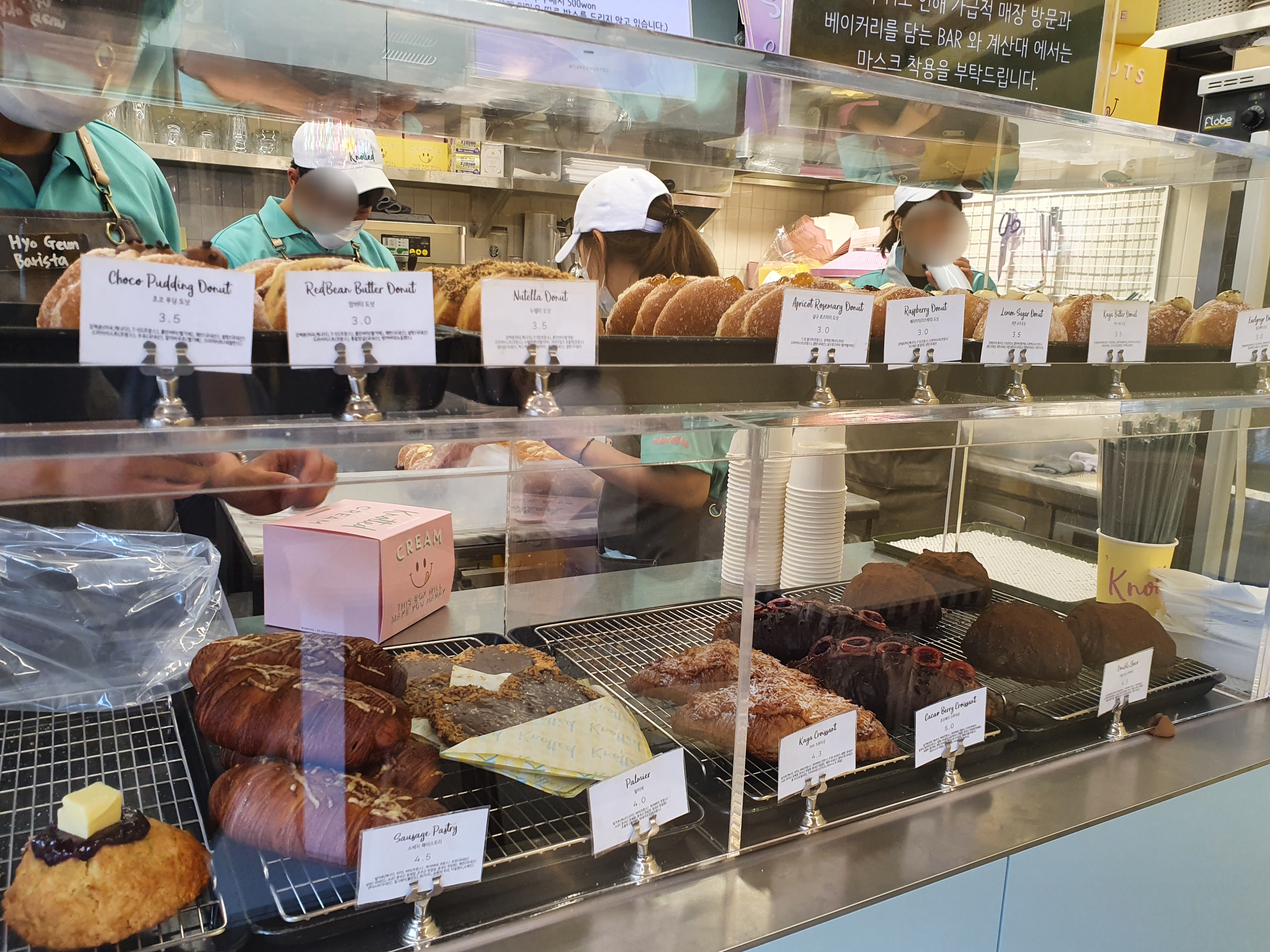 오후 늦게 갔더니 인기있는 오리지널 슈가 도넛은 이미 다 팔리고 없어서 아쉬웠어요. 오리지널 대신 저는 누텔라, 초코크림, 얼그레이, 레몬슈가 이렇게 네 가지를 선택해서 포장을 부탁드렸어요. 도넛은 종류별로 가격차이가 조금씩 있는데, 3000원에서 3500원 선이에요.