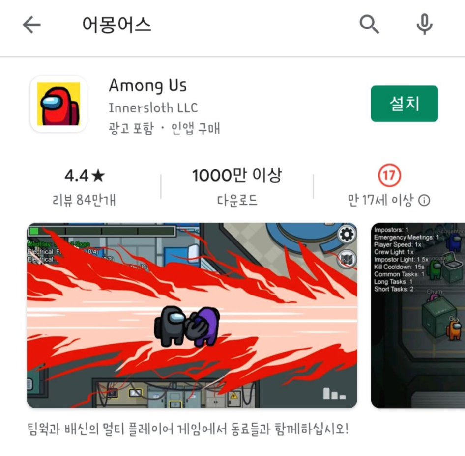 코로나바이러스로 집에 있는 시간이 길어지면서 모바일 게임이나 해볼까 하고 순위를 검색해봤는데 높은 순위권에 어몽어스라는 게임이 있어서 한 번 다운을 받아봤습니다. 구글 플레이에 어몽어스(Among Us)를 검색하면 맨 위에 검색이 됩니다.
