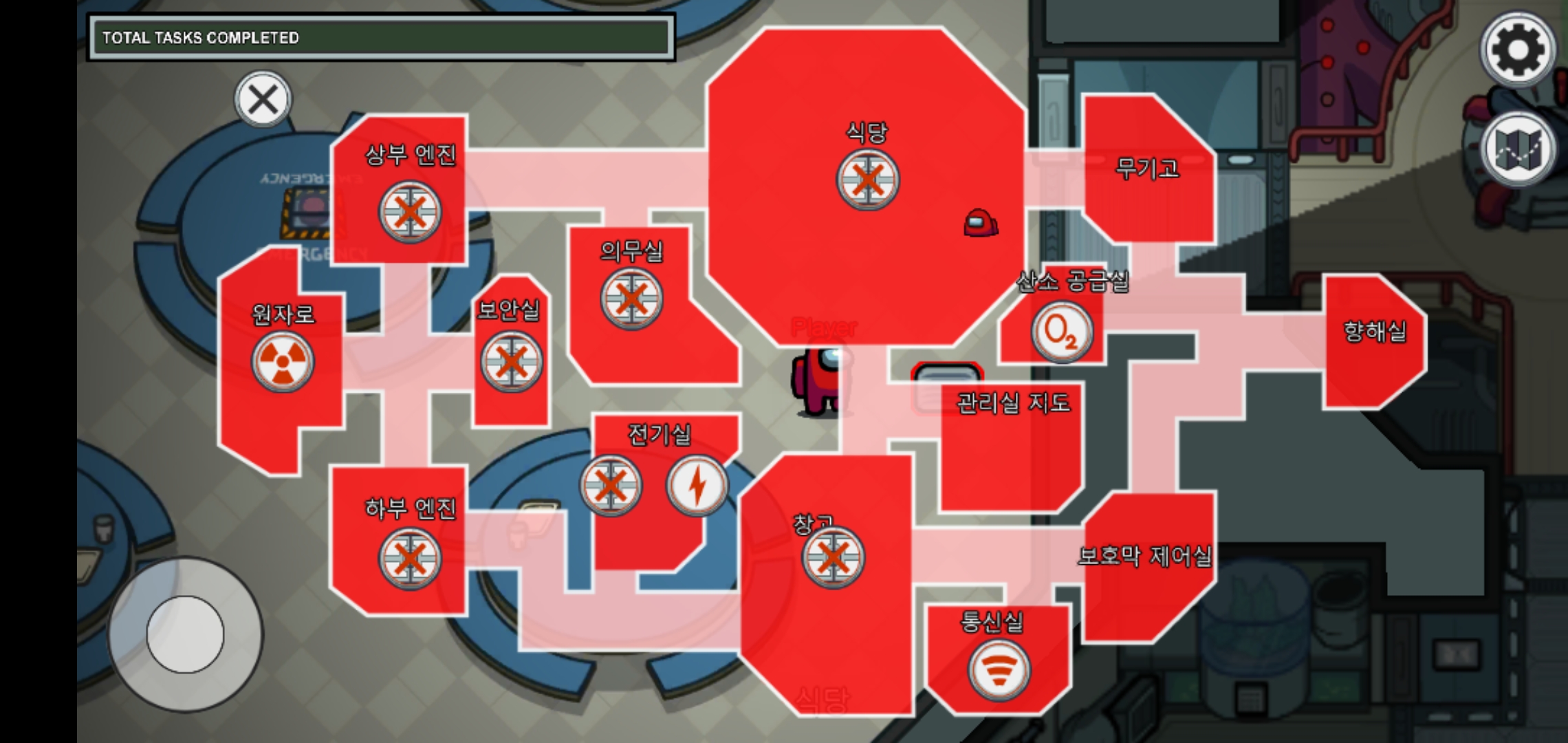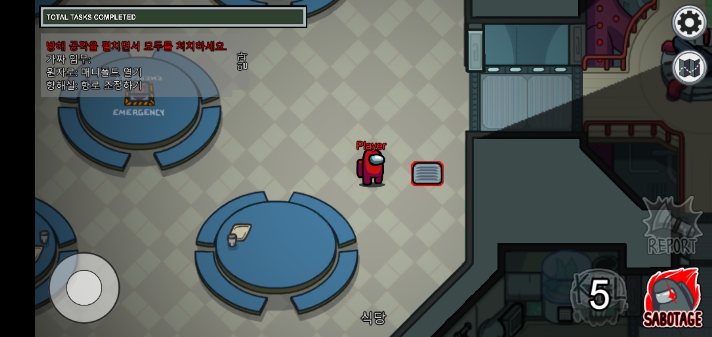 왼쪽 상단에는 해야할 임무들이 나오고 임포스터가 되면 사보티지라고 해서 방해공작도 펼칠 수 있습니다. 방해공작으로는 문을 닫아서 진입로를 차단할 수도 있고 산소를 차단할 수도 있습니다. 이곳은 우주선이라는 것을 기억해주세요!