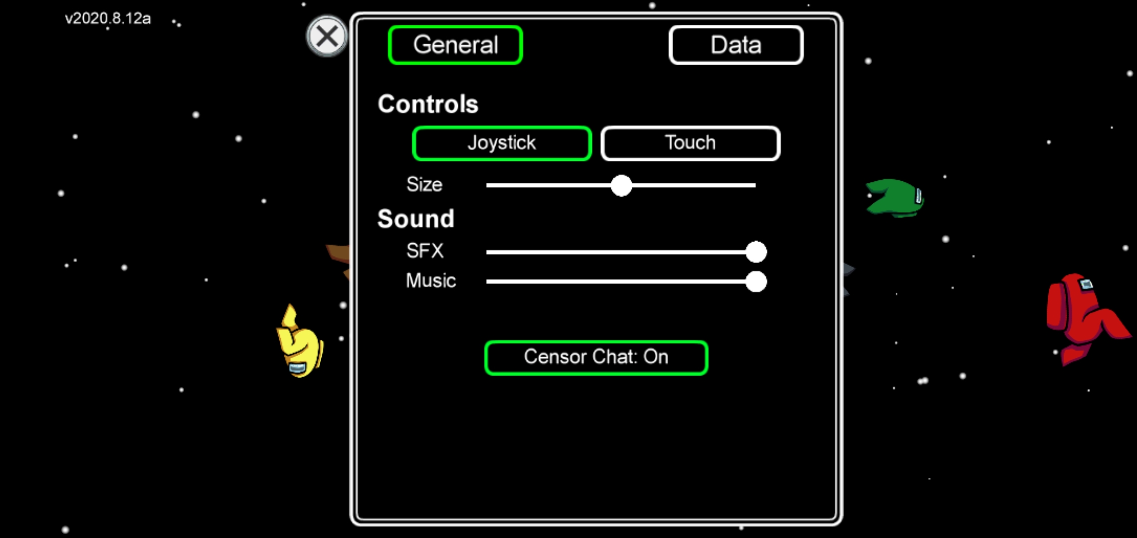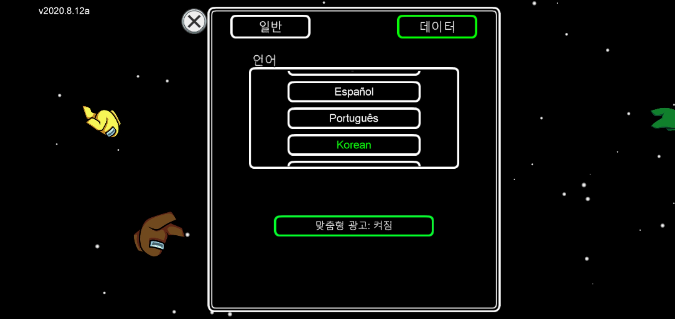 여기서 데이터를 누르고 언어를 클릭하면 Korean으로 설정이 돼요! 어몽어스 한글설정이 완료되었으니 본격적으로 시작해보겠습니다.
