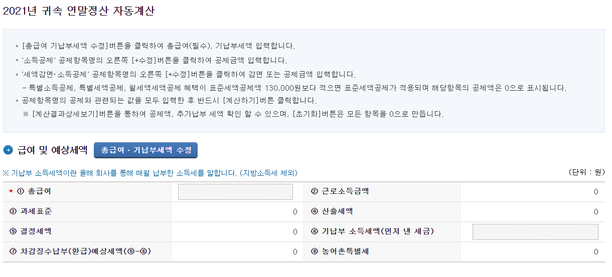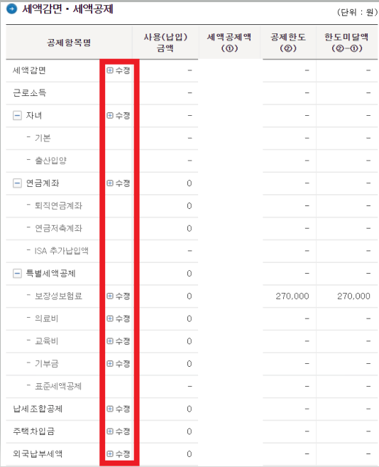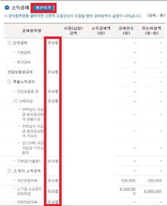 그리고 소득공제 부분을 입력해야 하는데 각각 수정을 눌러 내가 낸 금액을 수정해서 입력한 후에 계산하기를 눌러주시면 됩니다.