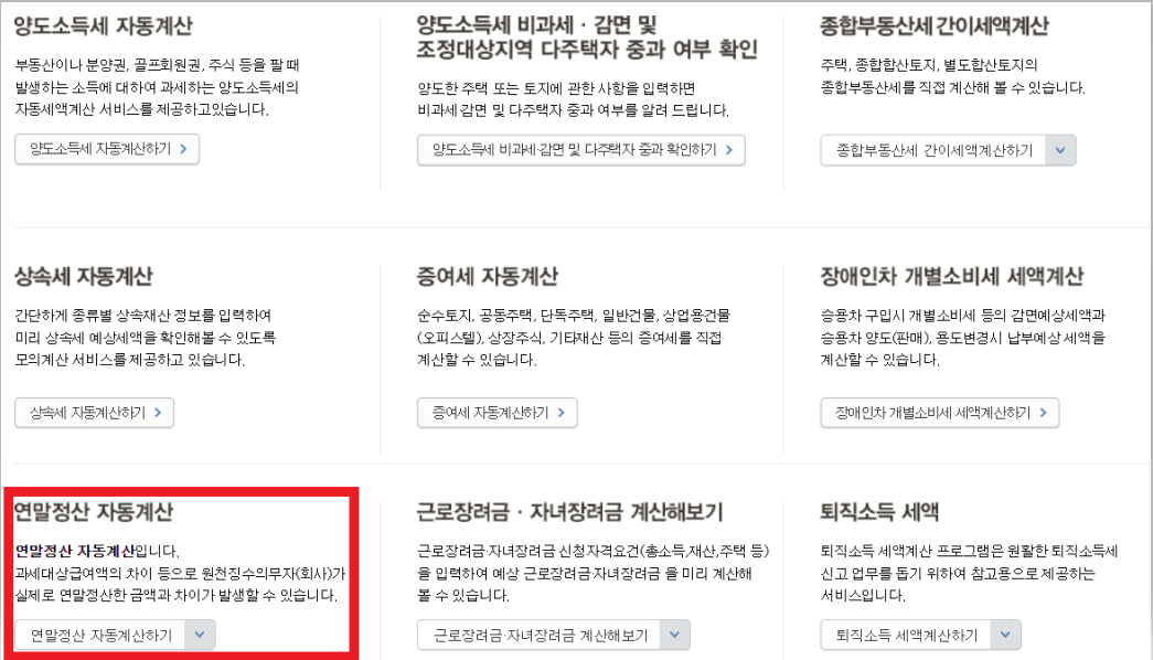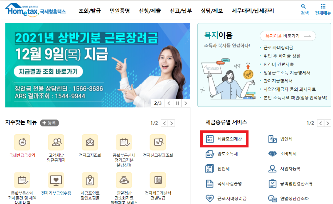 홈택스 홈페이지에 가면 세금종류별 서비스를 볼 수 있는데 거기서 세금모의계산을 클릭해주세요.