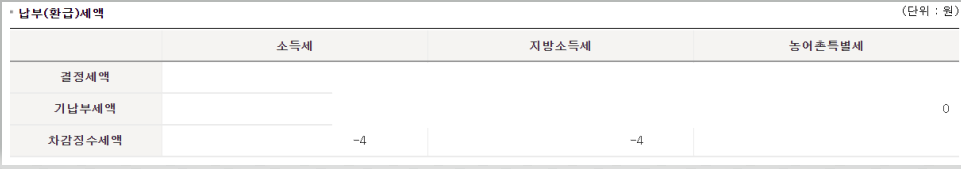 상세하게 결과를 확인할 수 있는데 결론만 보고 싶으시면 스크롤을 쭉 내리셔서 마지막 표를 봐주세요. 맨 아랫부분에 차감징수세액이 마이너스로 되어 있으면 13월의 월급을 받으시는 것이고 플러스로 되어 있으면 13월의 세금 당첨입니다.