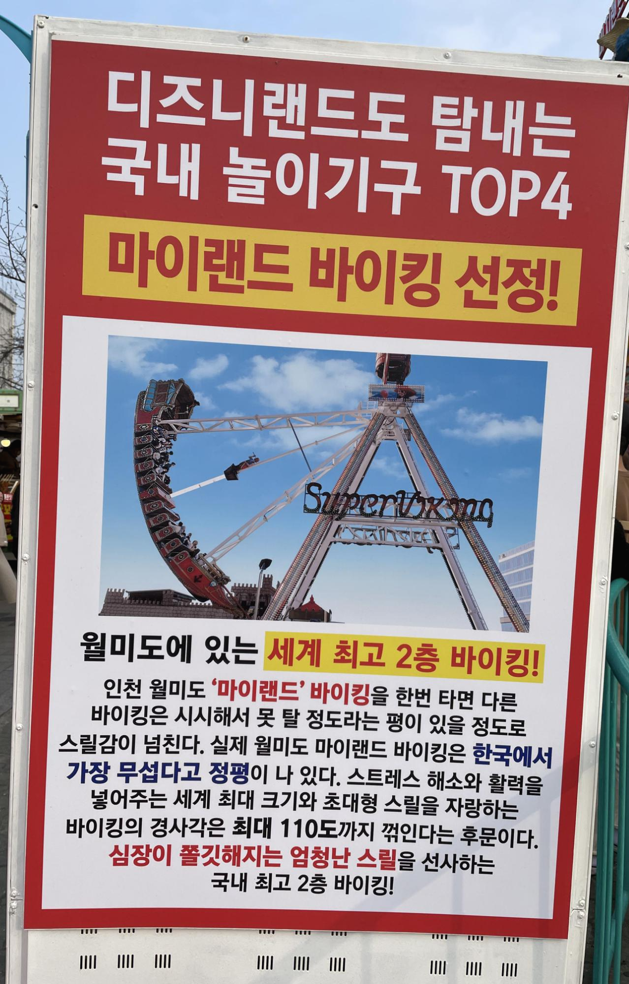 다시 마이랜드로 돌아가서 바이킹을 탈까말까 고민하던 찰나에 발견한 안내문! 인천 월미도 마이랜드 바이킹을 한 번 타면 다른 바이킹은 시시해서 못탈 정도라는 평이 있을 정도로 스릴감이 넘친다고 하니 한 번 타보기로 했다. 경사각이 최대 110도까지 꺾인다고 하니, 심지어 2층에 있는 바이킹이라고 하니 타볼만하다.