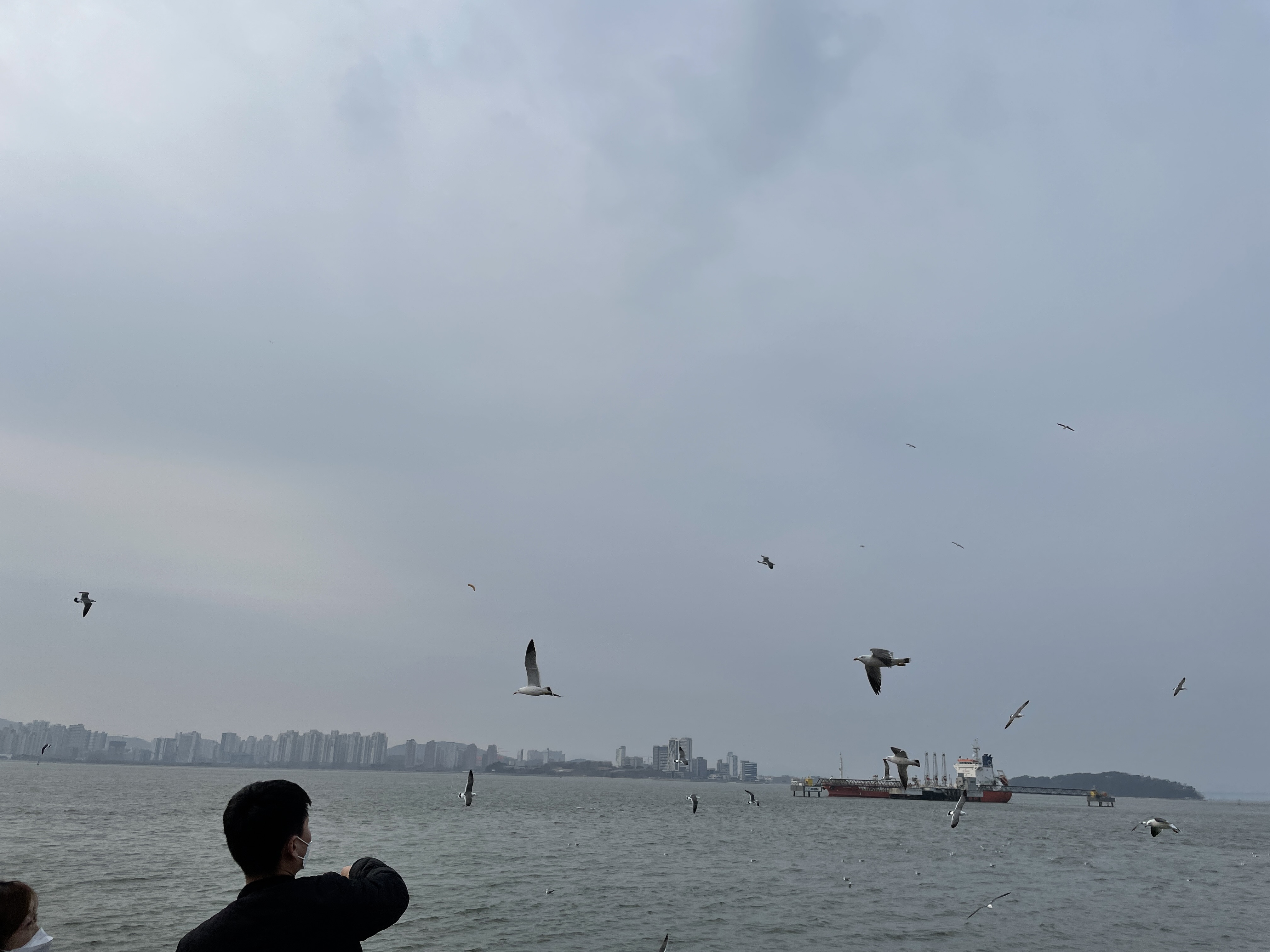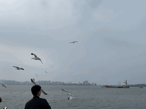 묘기 부리는 것처럼 잘 받아먹는 갈매기들! 갈매기들 이러다가 사냥하는 방법 까먹을까봐 걱정된다. 아무래도 새우깡에는 MSG가 들어갔으니 생새우보다 더 맛있겠지....