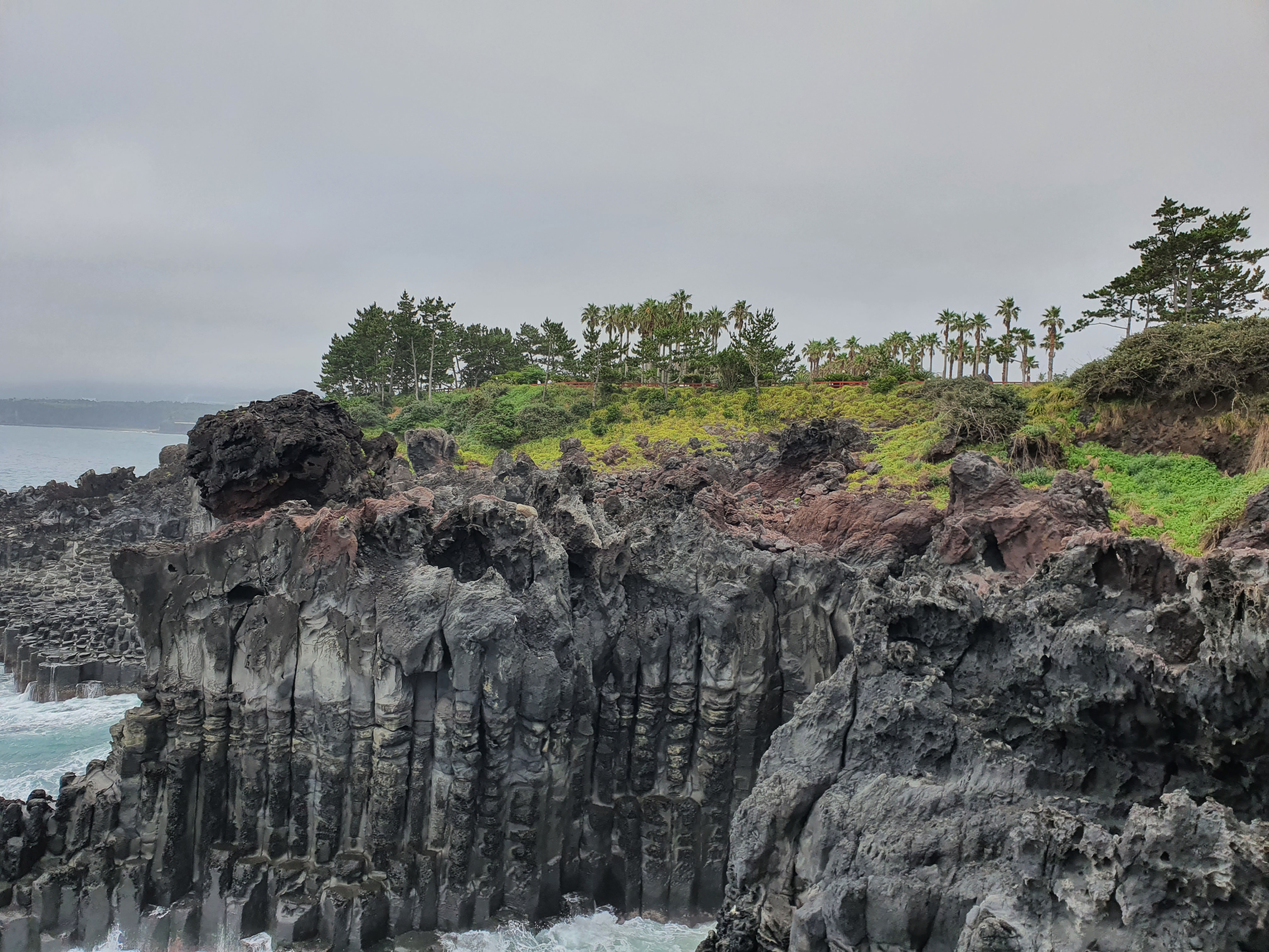 자세히 보면 주상절리의 모습이 선명해서 마치 누가 조각해놓은 것 같아요. 주상절리 윗쪽으로 심어져있는 야자수가 함께 프레임에 들어오니 이국적인 느낌을 주는 것 같아요.
