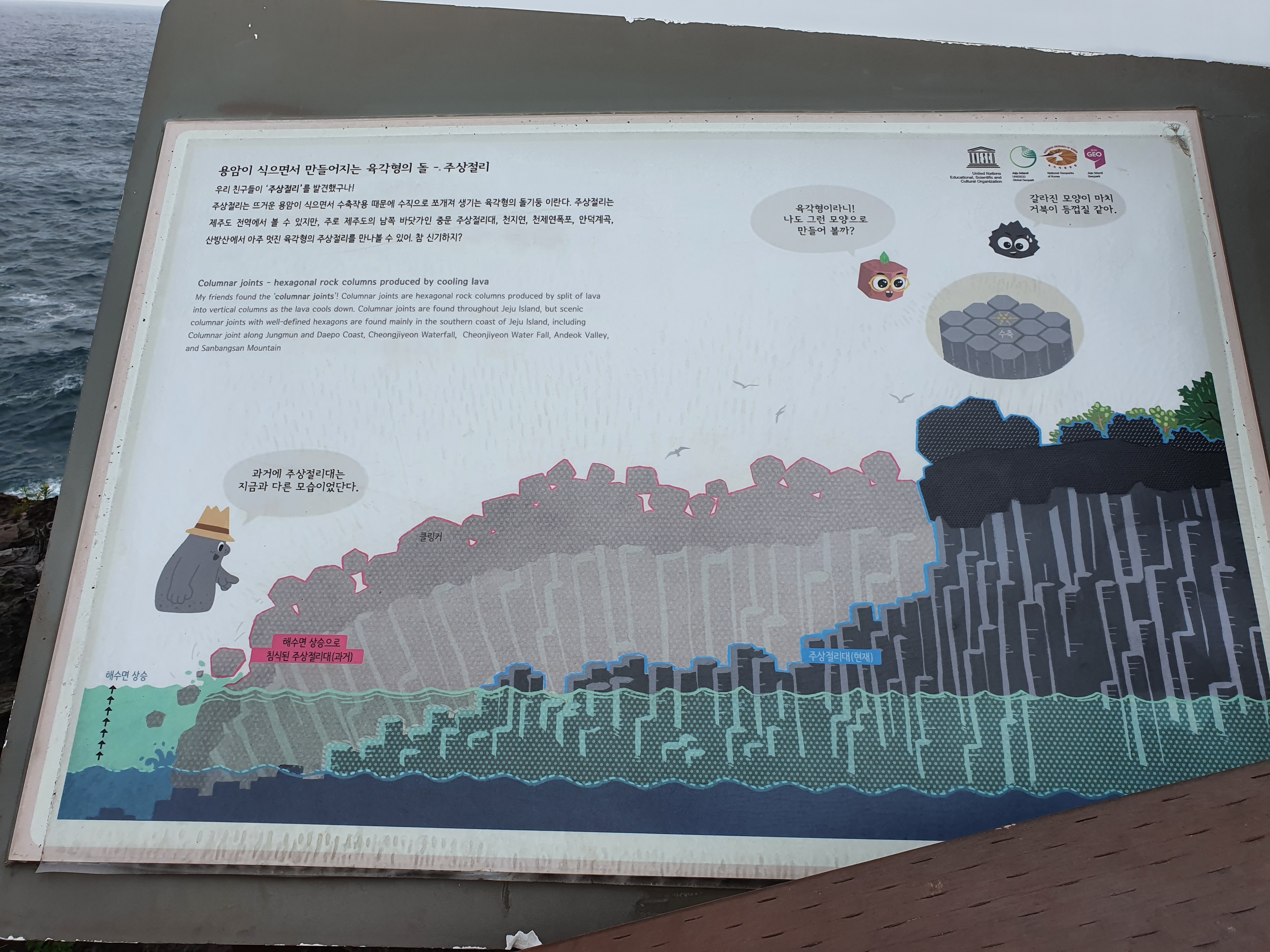 나무데크를 따라 옆으로 이동하다보면 나오는 주상절리에 대한 설명이에요. 주상절리는 용암이 식으면서 나타나는 육각형의 돌이라고 해요. 뜨거운 용암이 차가운 바닷물과 만나 급격하게 온도가 식으면서 수축작용이 발생해 육각형으로 쪼개지나봐요.