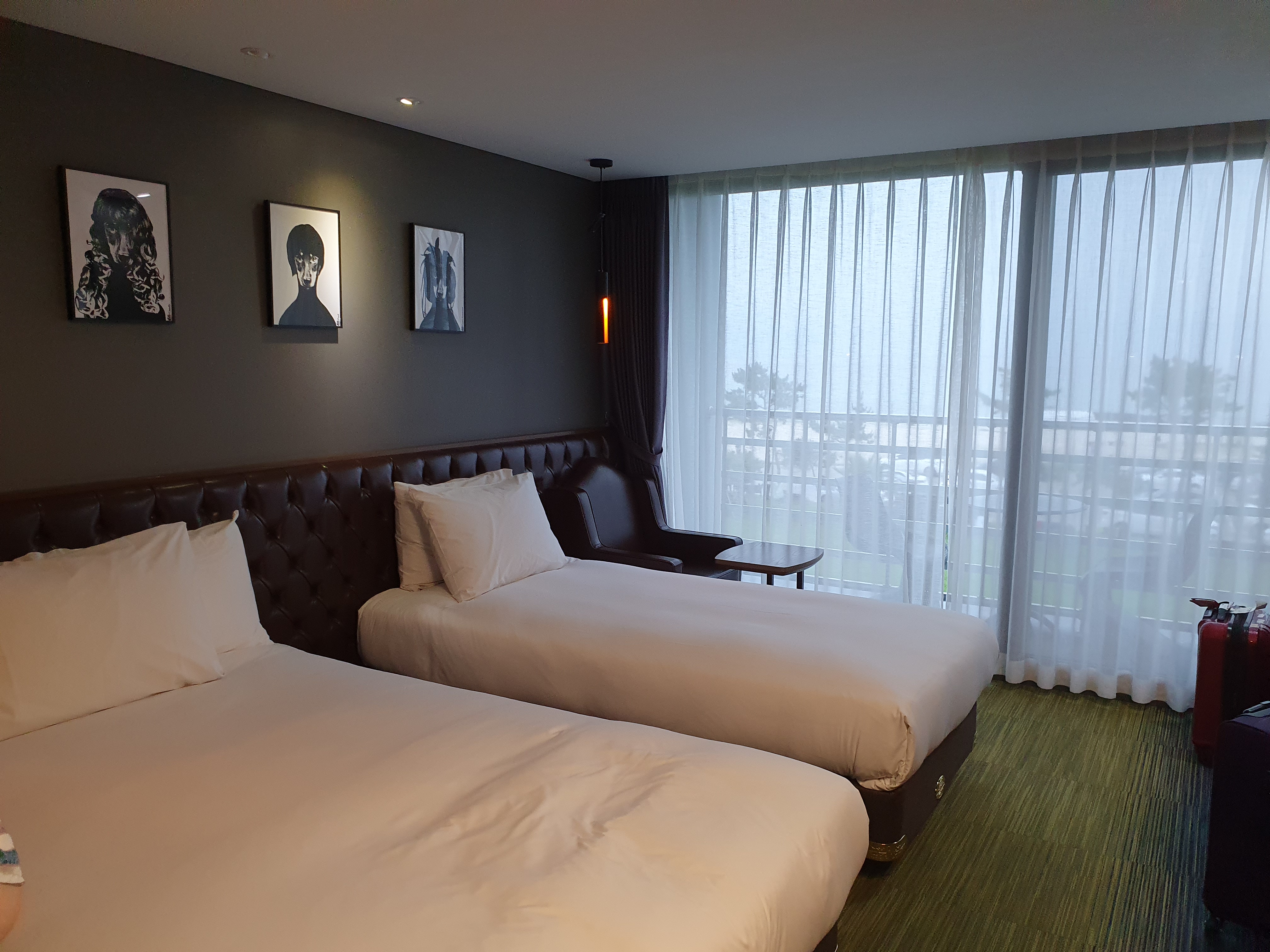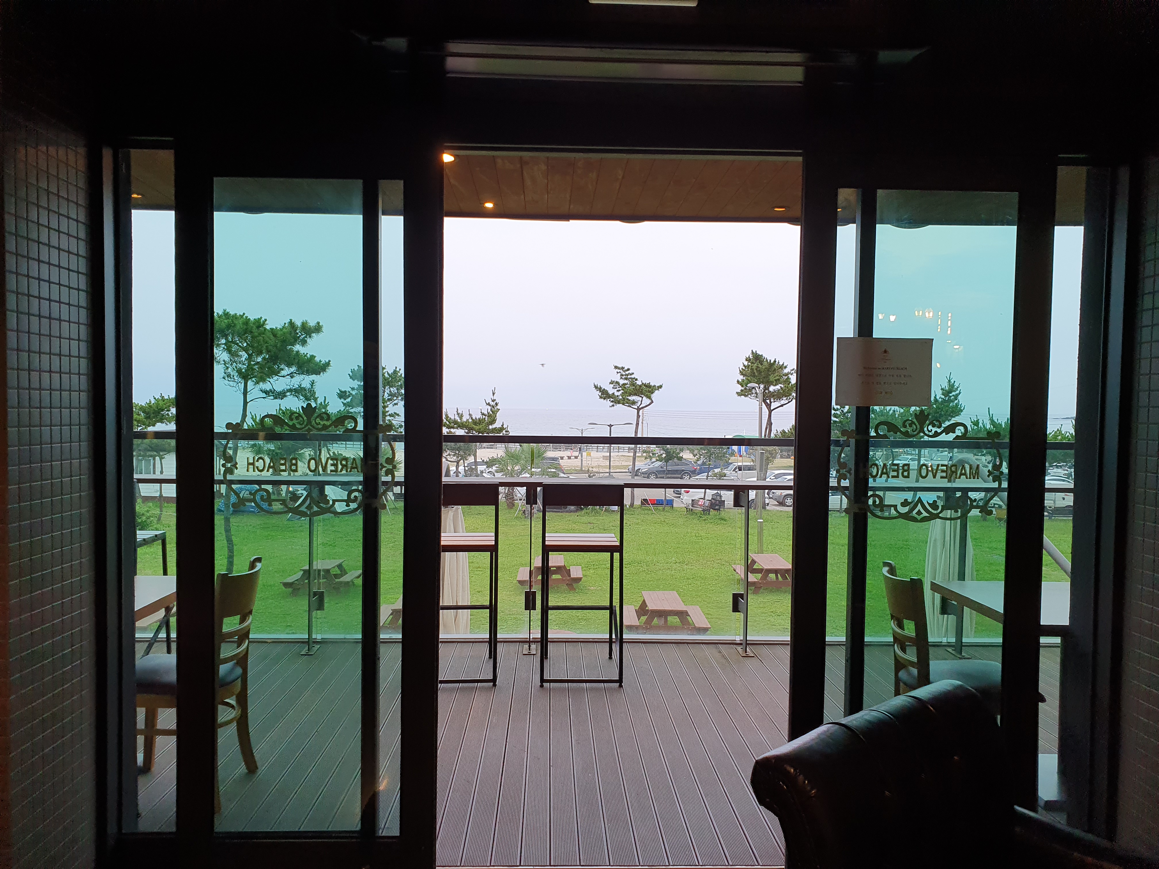 로비에 들어서는 순간 짠~ 바다가 바로 보입니다. 바람이 얼마나 센지 나뭇가지가.... 비가 와서 날씨는 좋지 않지만 비가 그치면 정말 예쁠거에요.