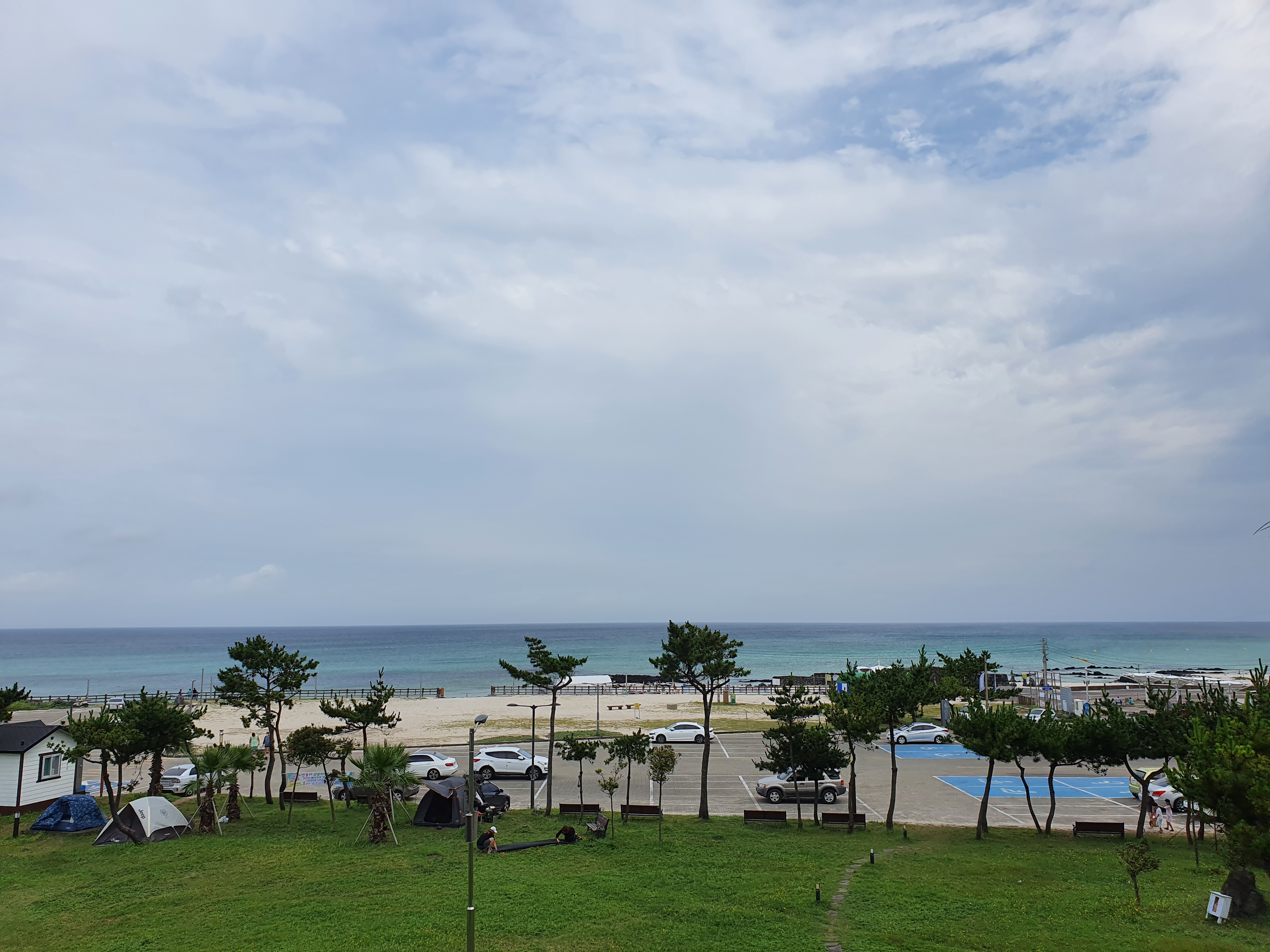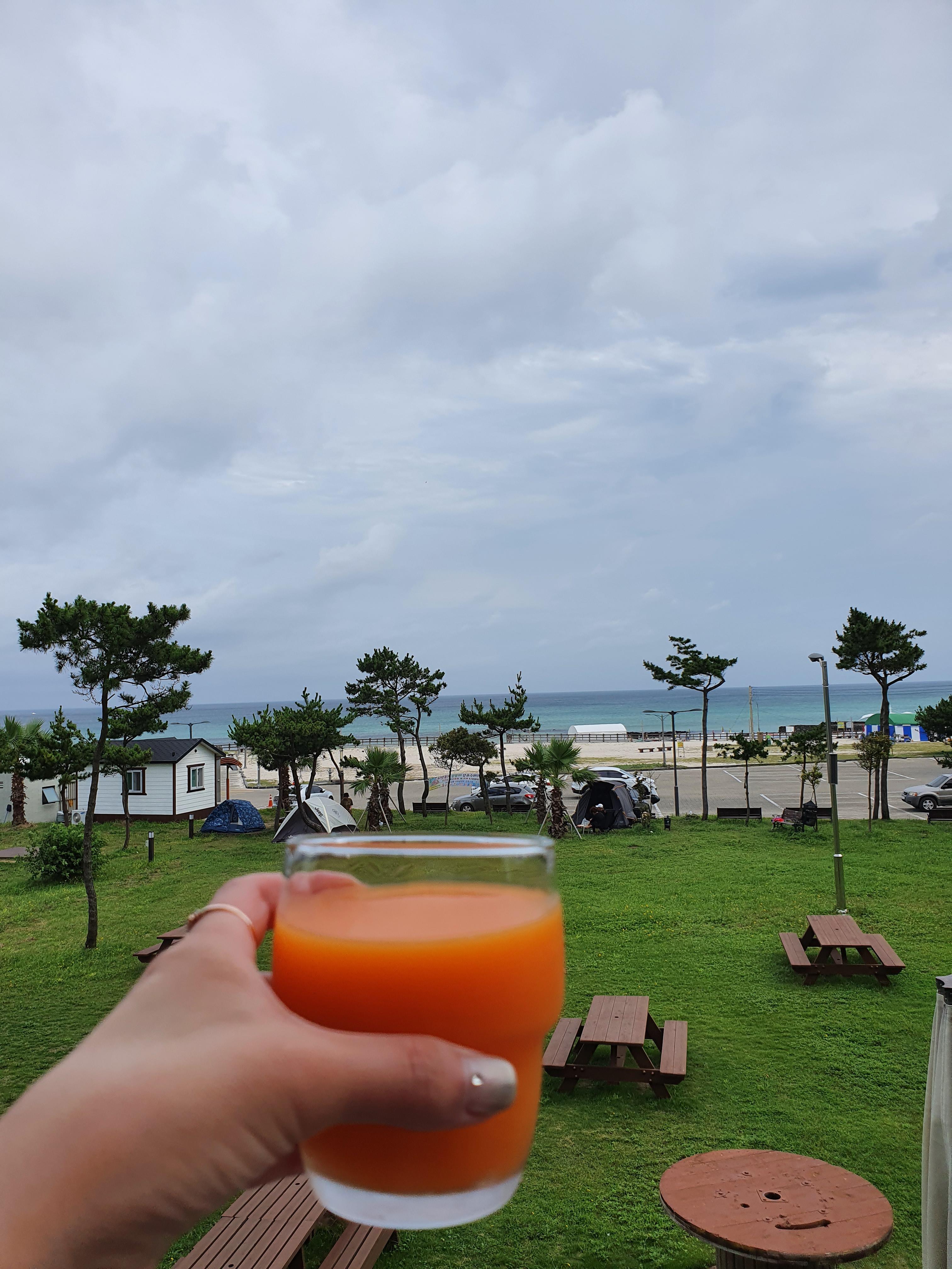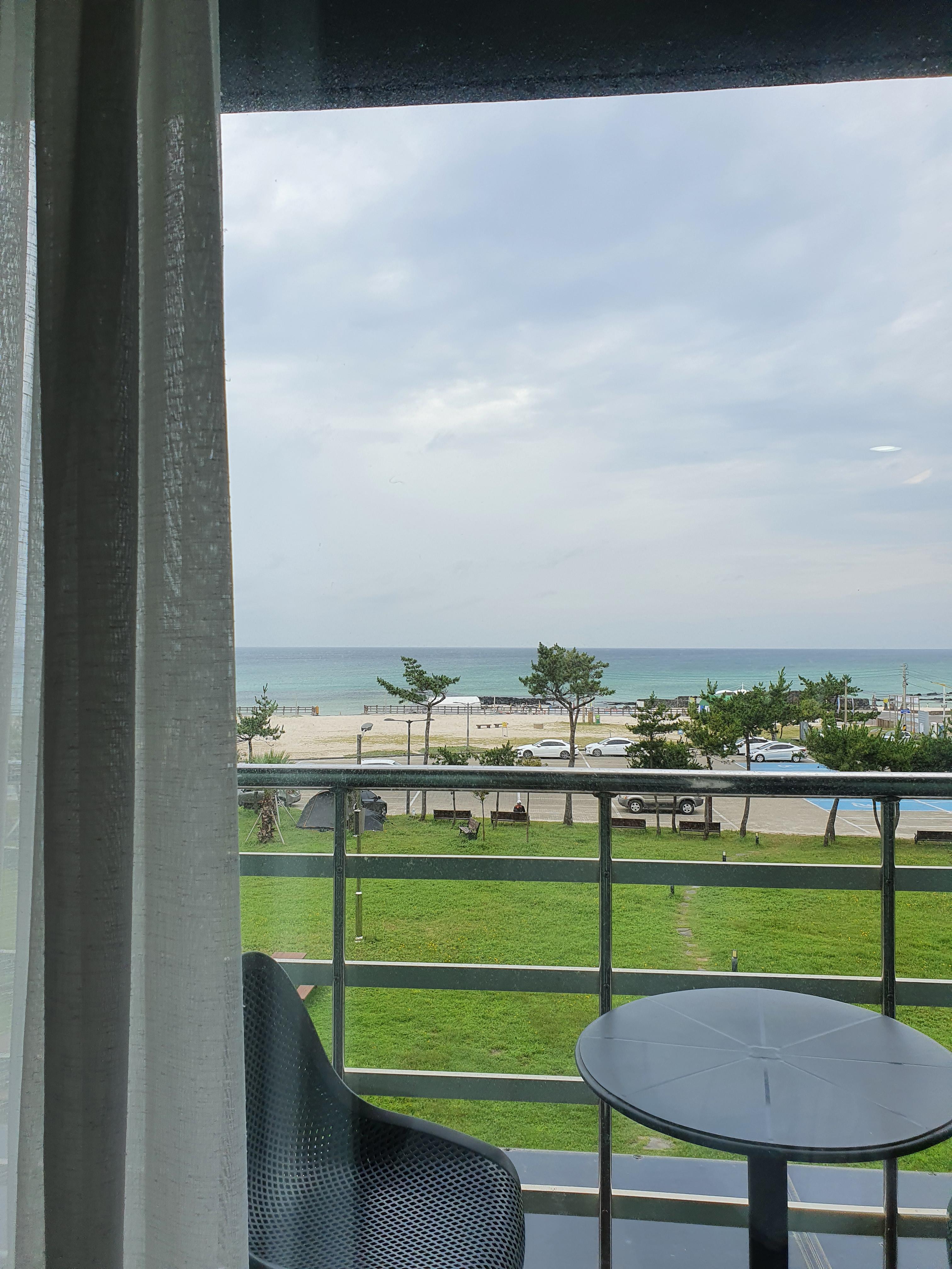 다음날 아침, 침대 위에서 찍은 창밖 사진이에요. 곽지해수욕장이 촤악 에메랄드빛으로 펼쳐져서 아침부터 기분이 산뜻했어요. 이거 보려고 마레보비치호텔 온거거든요!