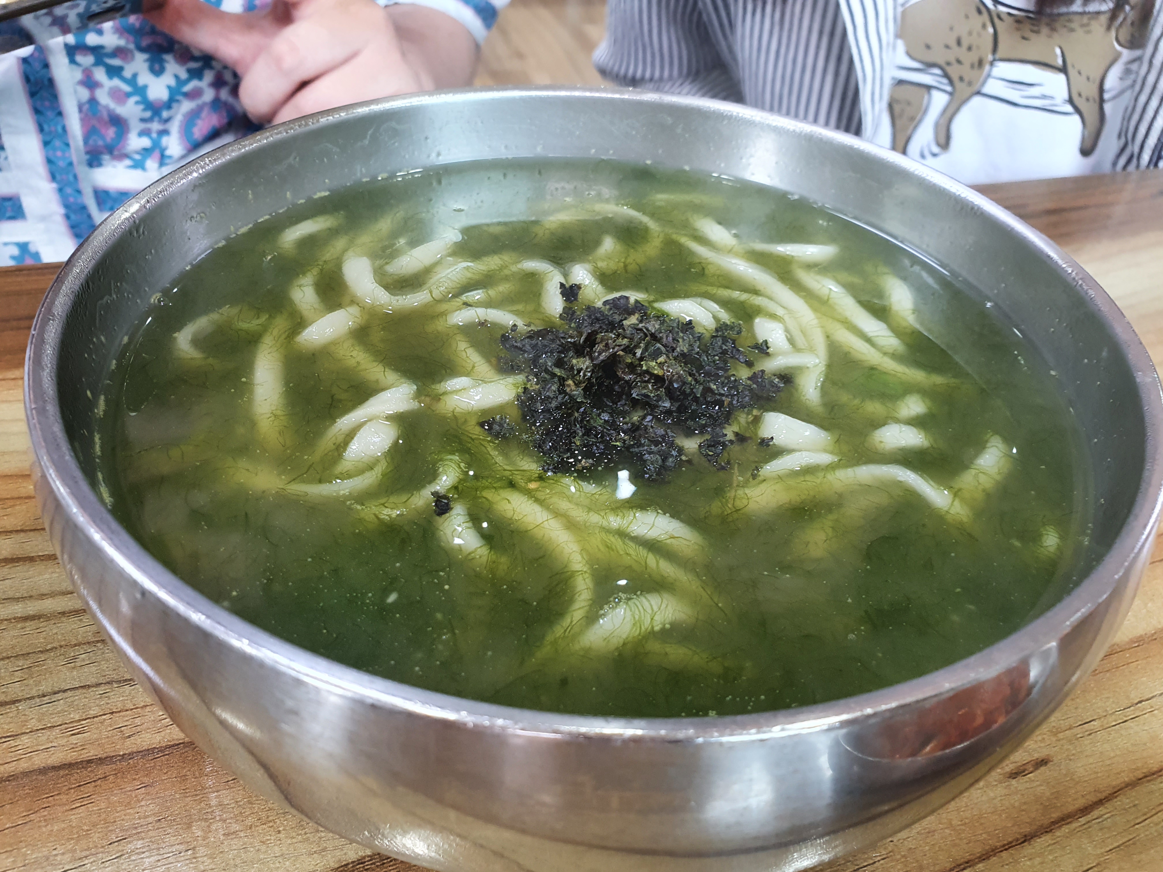 짜잔 보말칼국수가 먼저 나왔어요. 매생이 국물이 베이스인 것 같고 안에 보말이 가득 들어있어요!