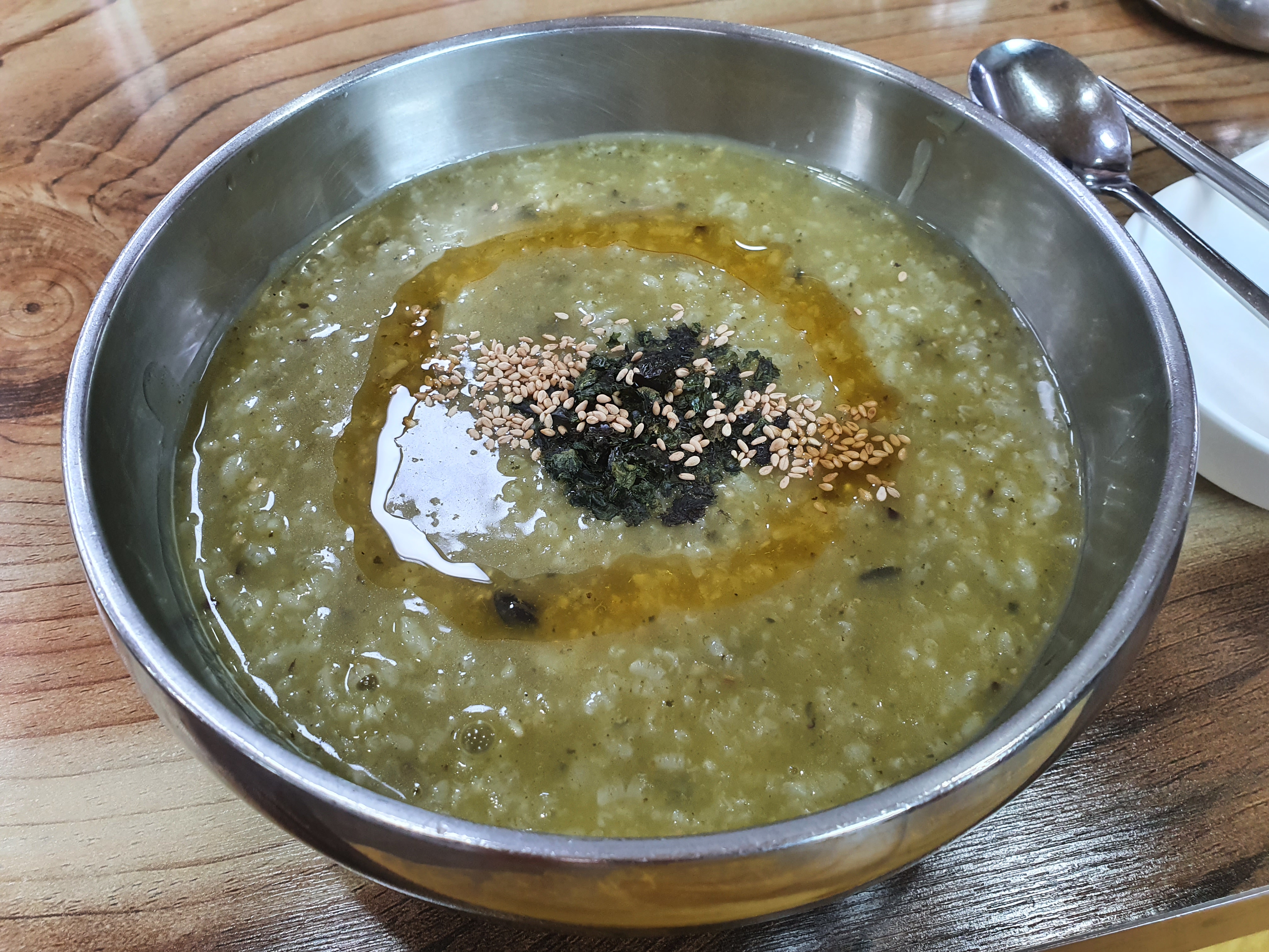 다음은 보말죽인데 보말을 갈아넣어서 전복죽과 같은 비주얼이에요. 중간중간 보말이 큰 것들도 들어있는데요, 위에 참기름을 한 바퀴 둘러주니 고소한 맛이 더해집니다.