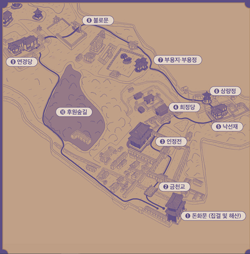 관람동선은 돈화문에서 집결하여 금천교 → 인정전 → 희정당 → 낙선재 → 상량정 → 부용지, 부용정 →불로문 →연경당 →후원숲길 → 돈화문에서 해산하는 코스로 진행됩니다.