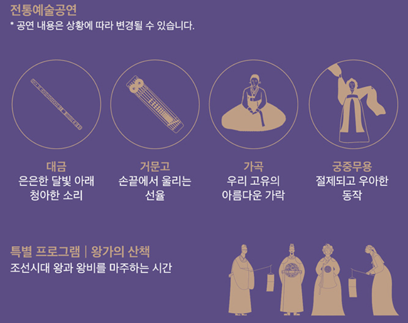 전통예술공연은 내용이 상황에 따라 변경될 수는 있으나 상량전에서는 대금 연주를, 연경당에서는 예술 공연을 볼 수 있겠습니다. 대금, 거문고, 가곡, 궁중무용 등을 감상하실 수 있는데 우리의 소리, 우리의 가락, 우리의 아름다운 몸짓을 감상할 수 있는 좋은 기회가 되지 않을까 싶습니다. 그리고 왕가의 산책이라는 특별 프로그램이 진행되는데 과거 왕과 왕비가 궁궐을 어떻게 산책했는지 볼 수 있습니다.
