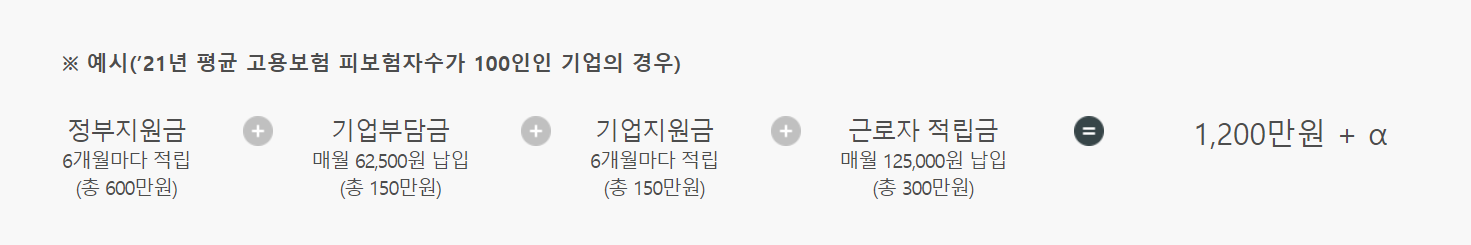 ① 청년 : 매월 12만 5천원씩 2년간 300만원 저금하면 정부(취업지원금 600만원)와 기업(300만원, 정부지원)이 공동적립하여 2년 후 만기 시 약 1,200만원을 수령할 수 있습니다. 만기 후에는 중소벤처기업부에서 시행하는 내일채움공제(3~5년)로 연장가입하면 최대 8년의 장기적인 목돈마련이 가능합니다.