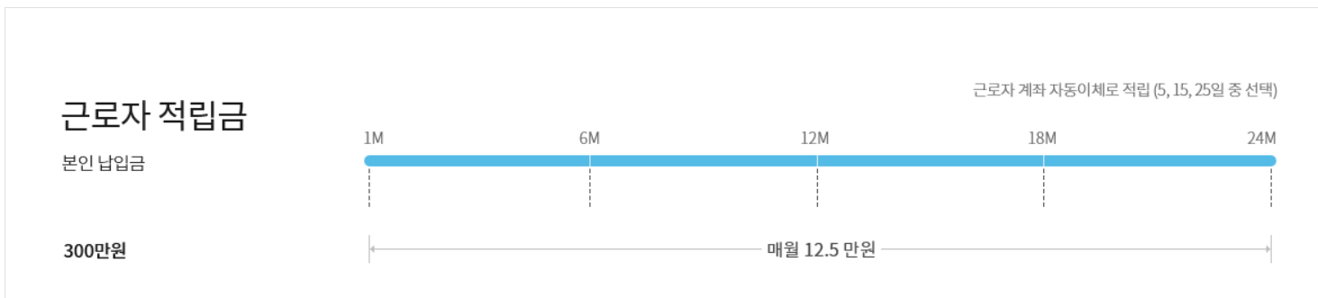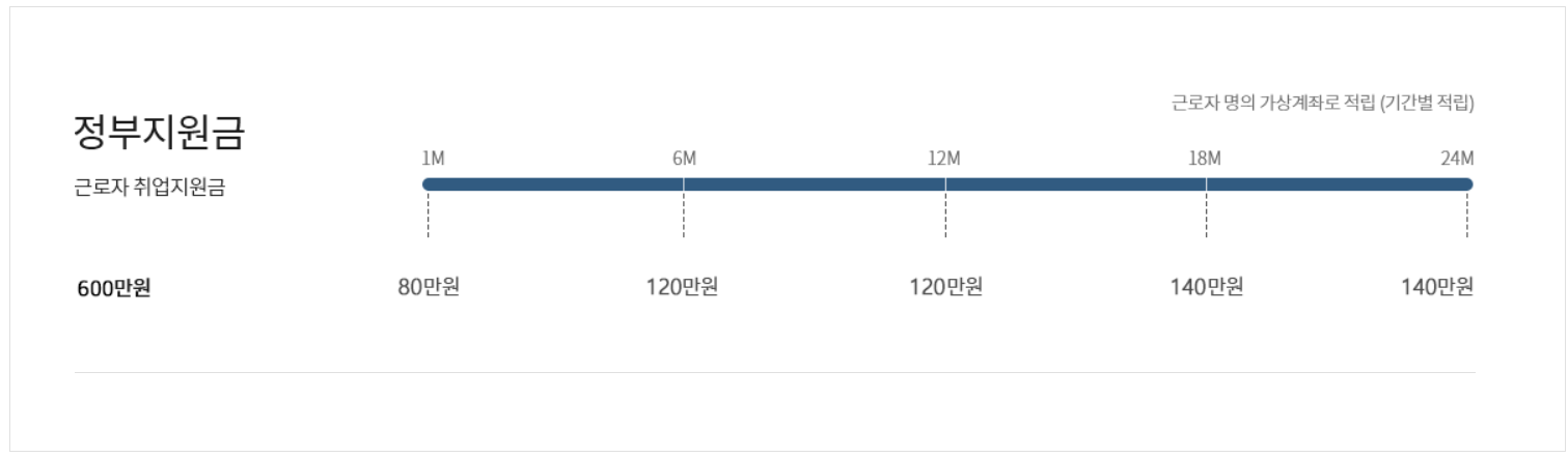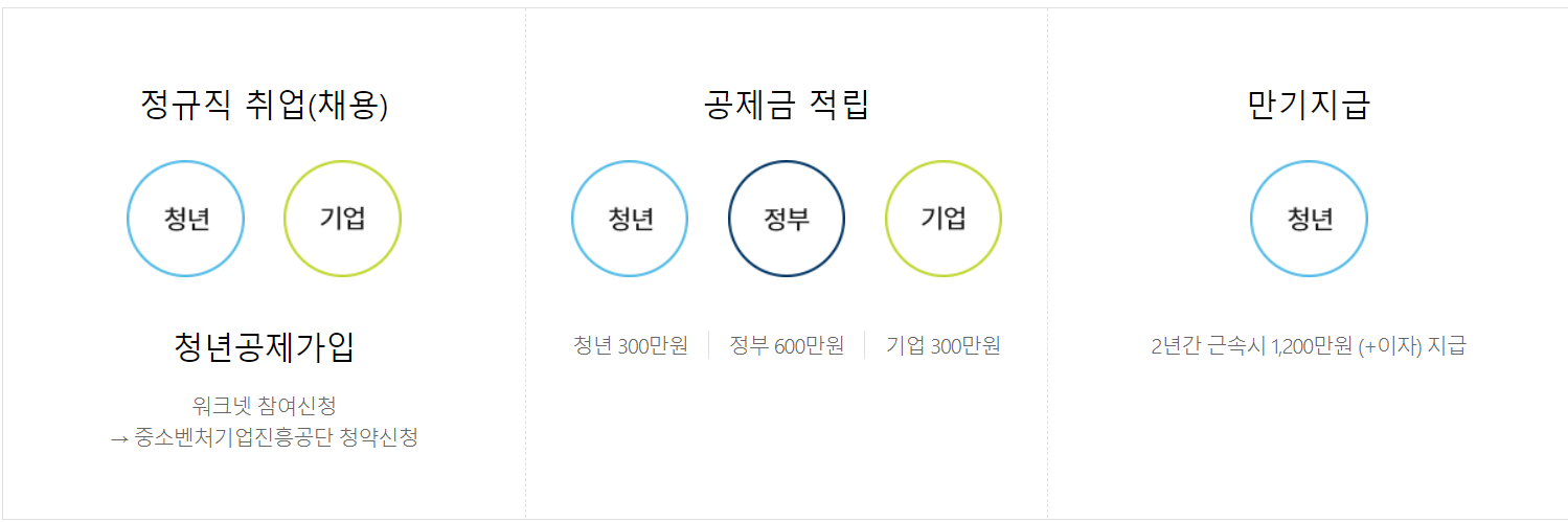 ① 청년 : 매월 12만 5천원씩 2년간 300만원 저금하면 정부(취업지원금 600만원)와 기업(300만원, 정부지원)이 공동적립하여 2년 후 만기 시 약 1,200만원을 수령할 수 있습니다. 만기 후에는 중소벤처기업부에서 시행하는 내일채움공제(3~5년)로 연장가입하면 최대 8년의 장기적인 목돈마련이 가능합니다.