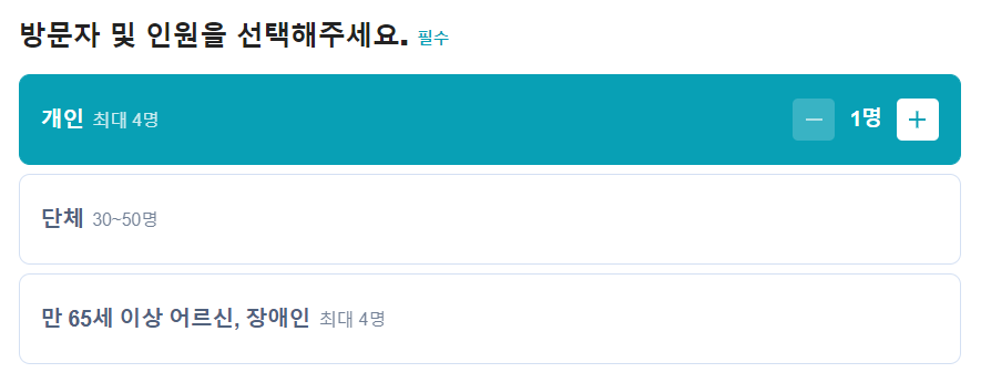 네이버, 카카오톡, 토스를 통해 관람신청 로그인을 했다면 가장 먼저 개인/단체/만 65세 이상 어르신, 장애인 중 선택합니다. 개인과 만 65세 어르신, 장애인의 경우 최대 4명까지 신청할 수 있고 단체는 30~50명까지 신청할 수 있습니다. 인원을 선택한 후에 방문 일정을 선택하실 수 있습니다.