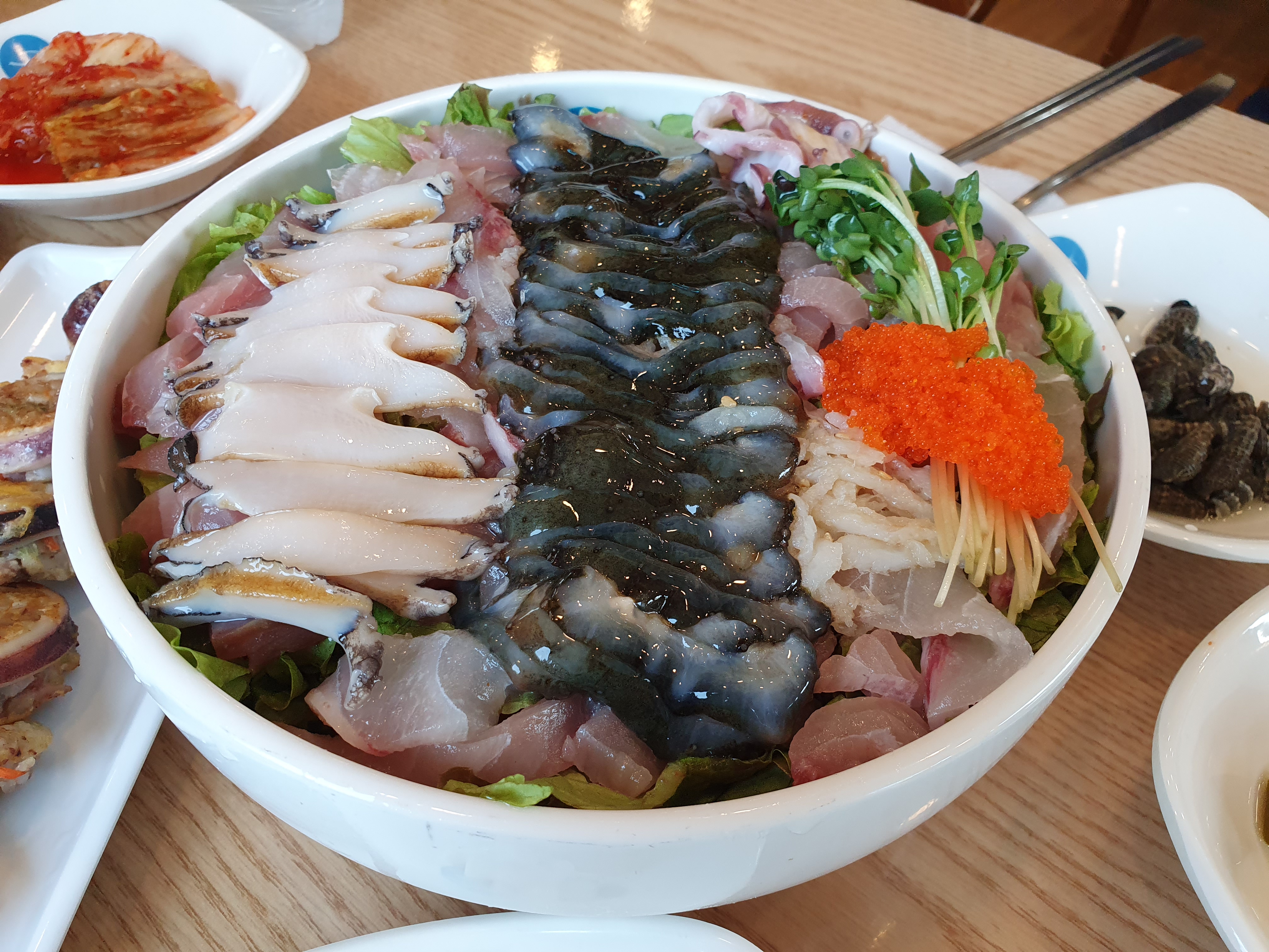 가족들과 이야기를 나누다보니 주문한 음식들이 나왔어요. 저 물회 좀 보세요. 저게 2인분이래요! 진짜 하나 더 시켰으면 큰일날뻔... 그리고 함께 시킨 오징어 순대에요.
