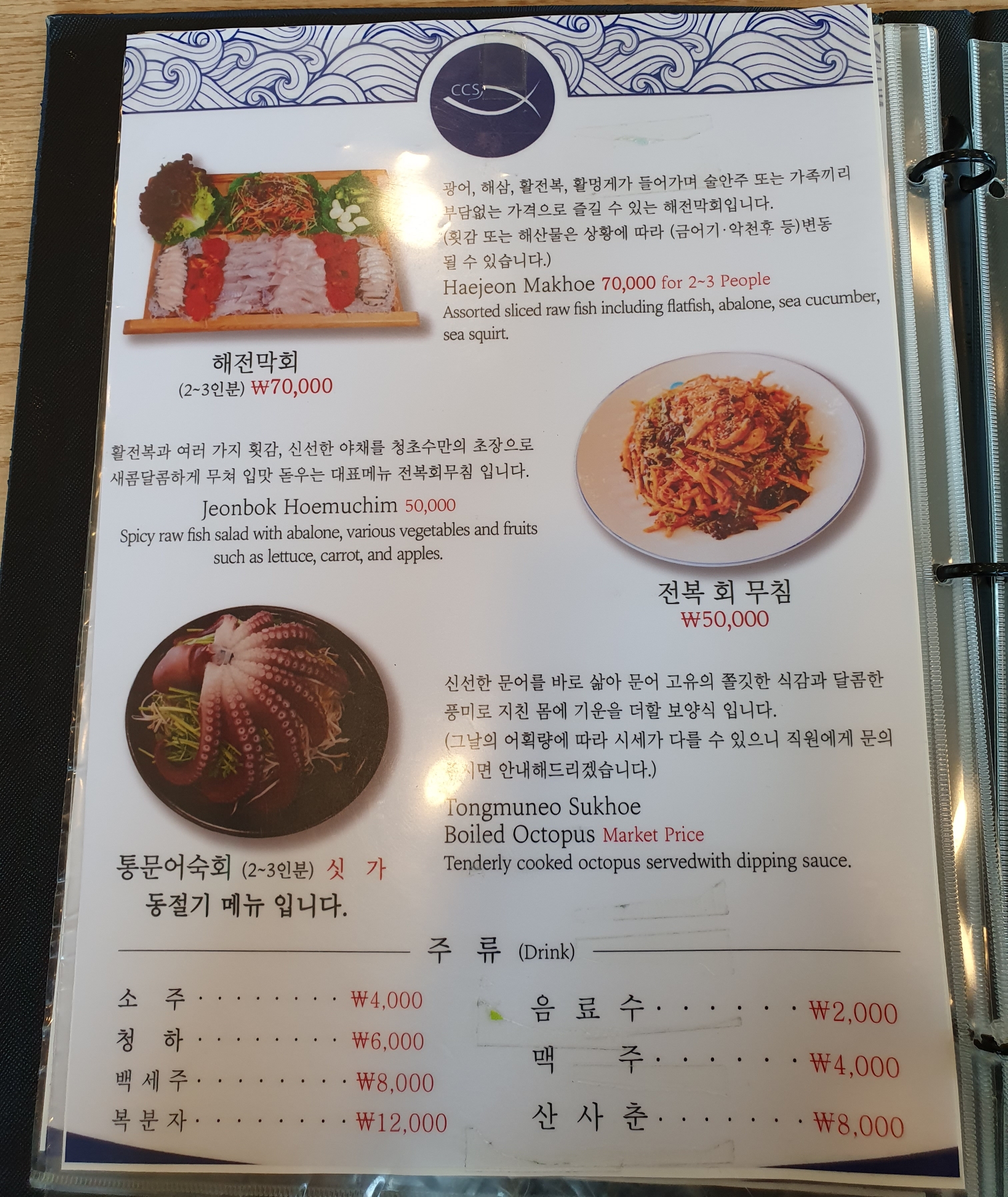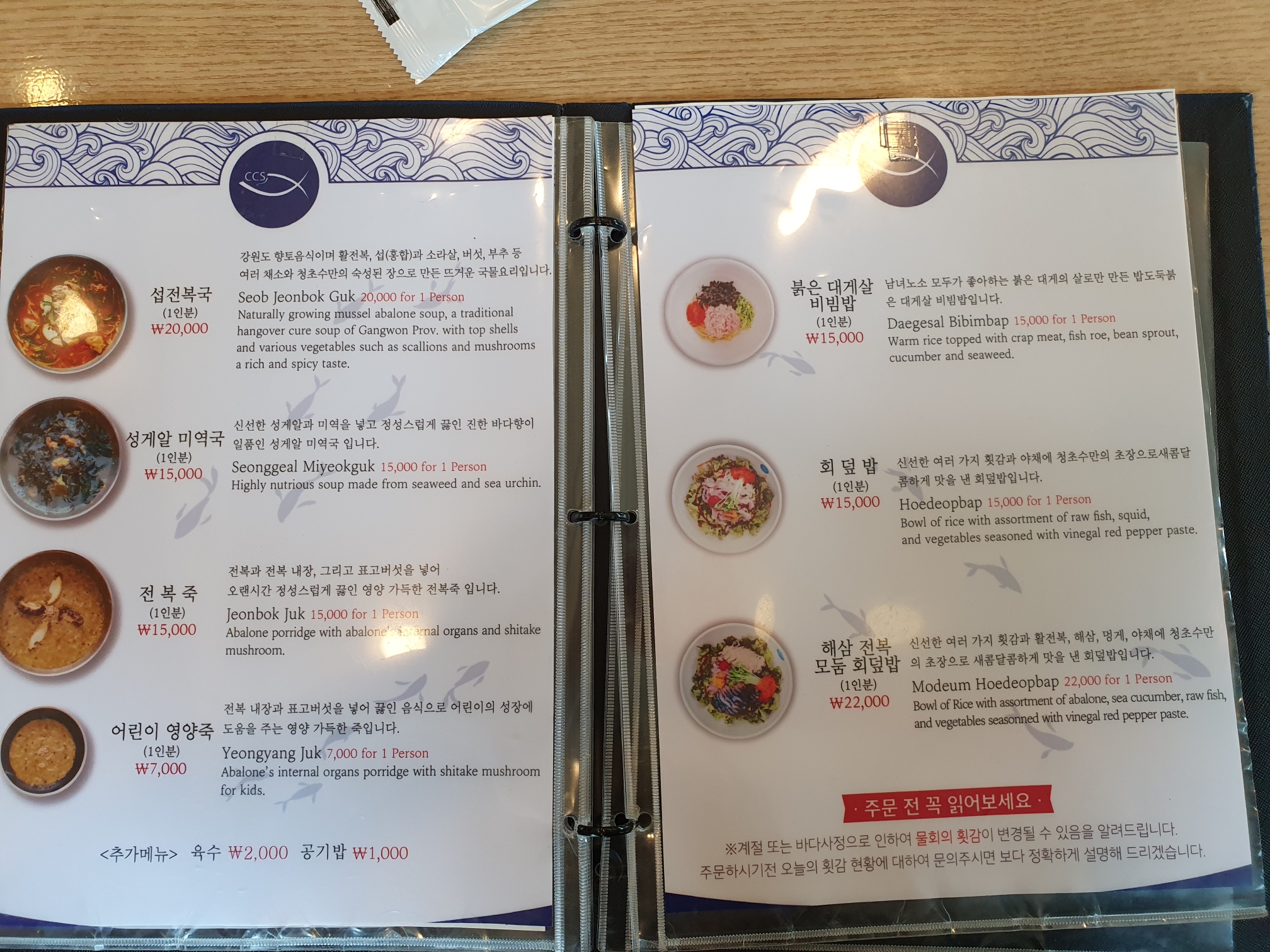 식당 내부모습이에요. 주로 물회를 많이 드시고 간간히 섭국 드시는 분들도 보입니다. 저는 당연히 물회를 먹으러 왔지만 또 뭐가 있나 메뉴판을 한번 볼게요!