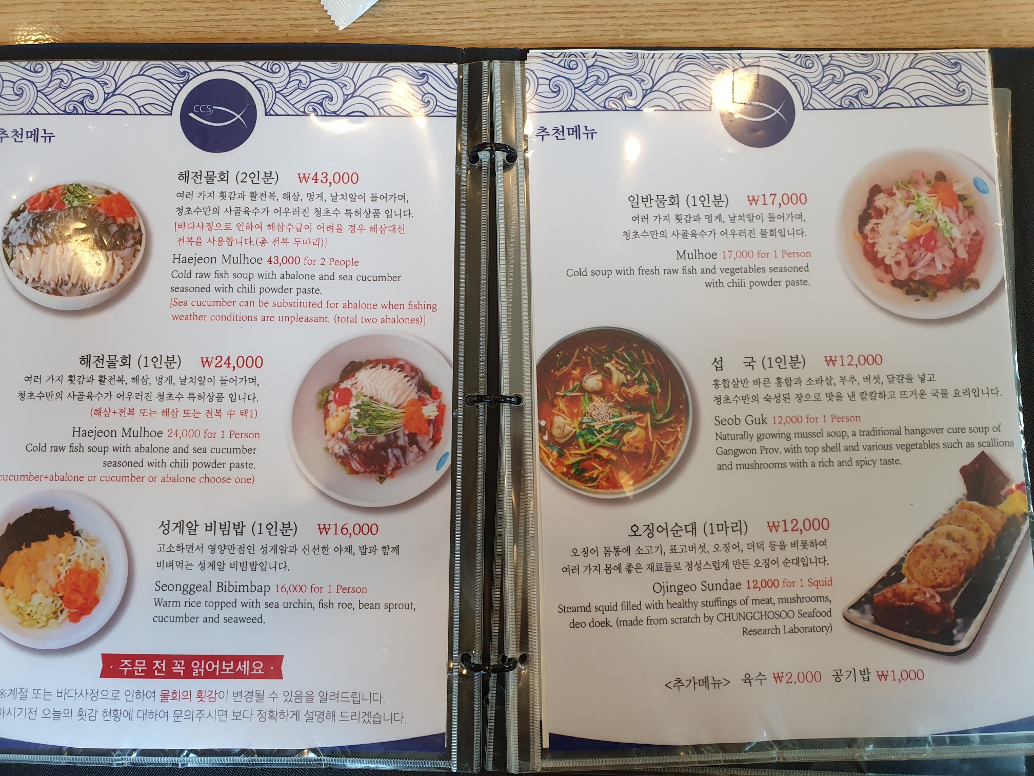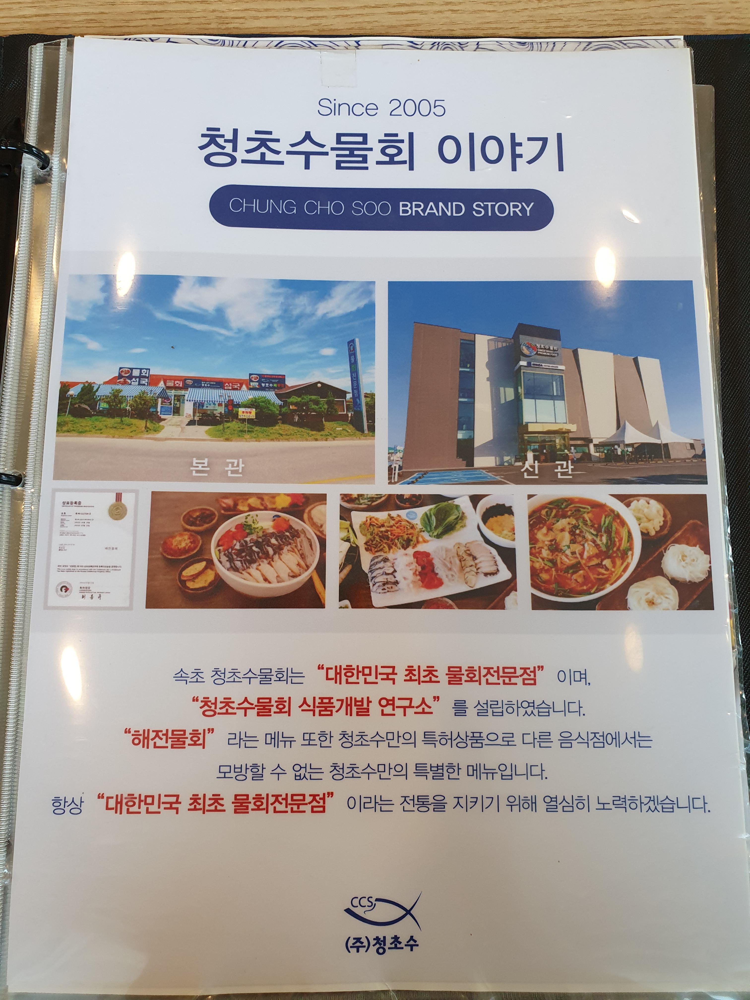 오웅... 다양한 메뉴가 있네요. 저희는 해전물회 2인과 오징어순대를 시켰어요. 물회만 3인분 시키면 양이 많을 것 같았어요. 음식 기다리는 동안 이것저것 보는데 메뉴판 맨 앞장에 청초수물회에 대한 이야기가 있네요. 대한민국 최초의 물회 전문점이래요!