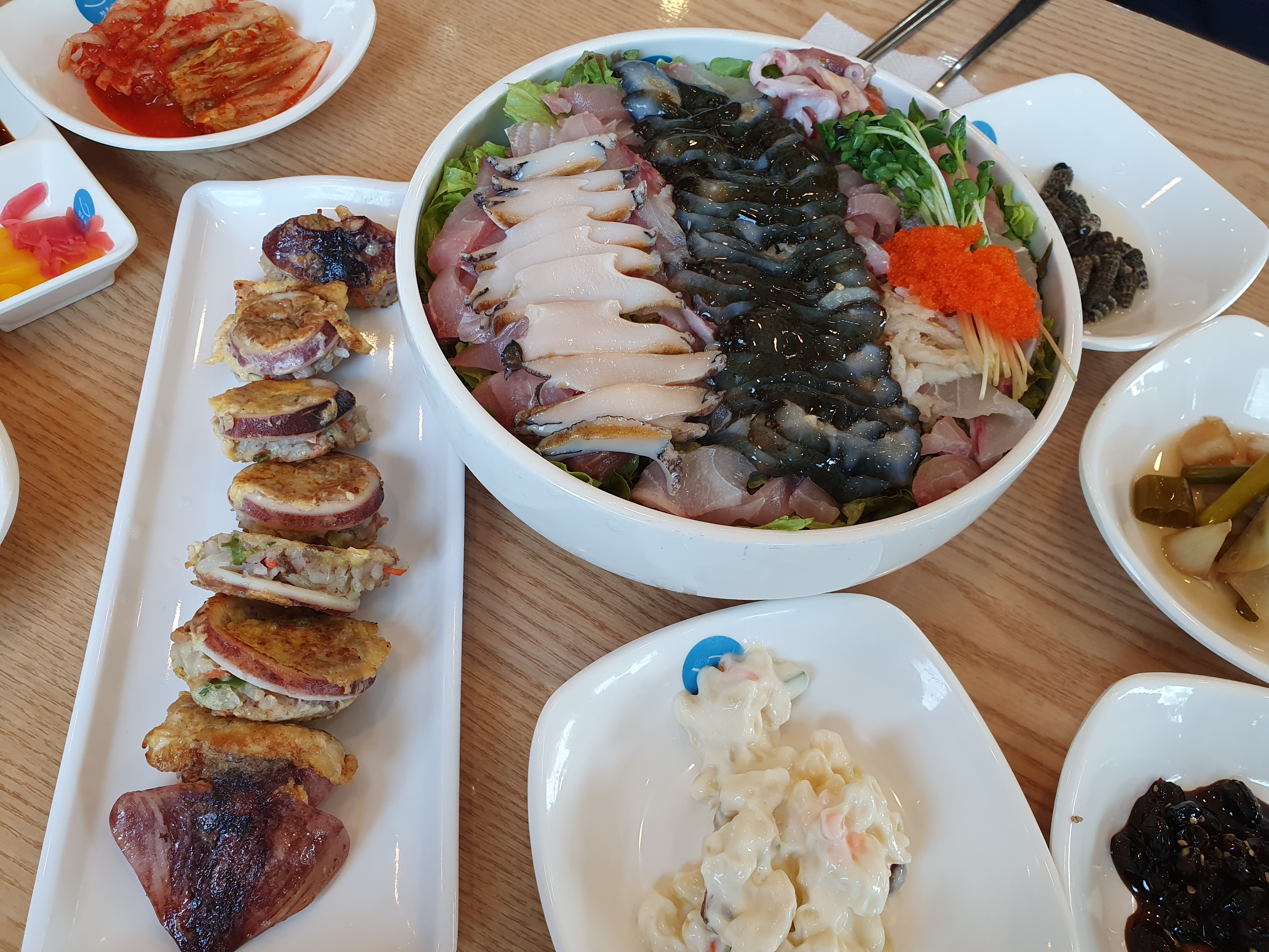 가족들과 이야기를 나누다보니 주문한 음식들이 나왔어요. 저 물회 좀 보세요. 저게 2인분이래요! 진짜 하나 더 시켰으면 큰일날뻔... 그리고 함께 시킨 오징어 순대에요.