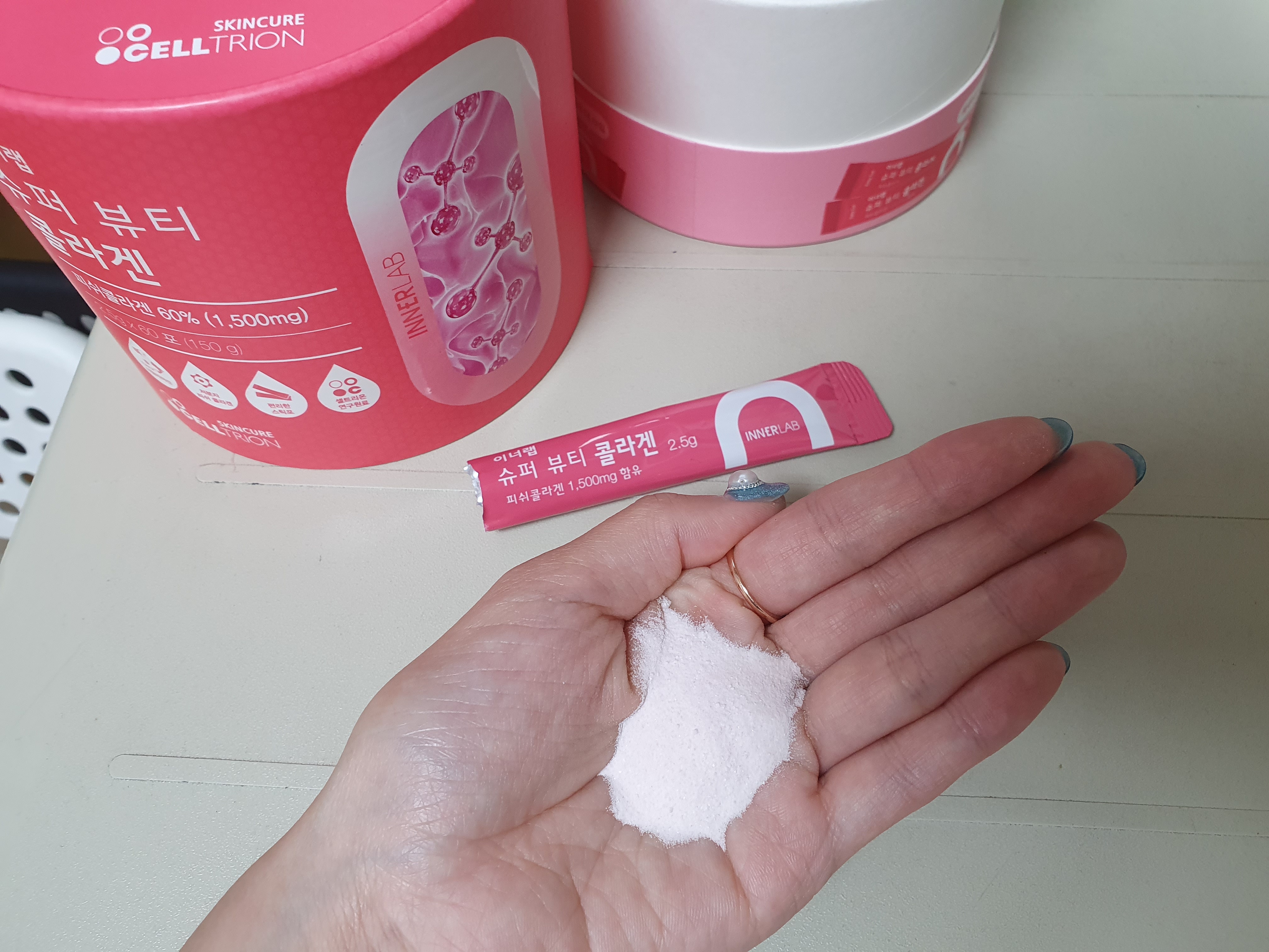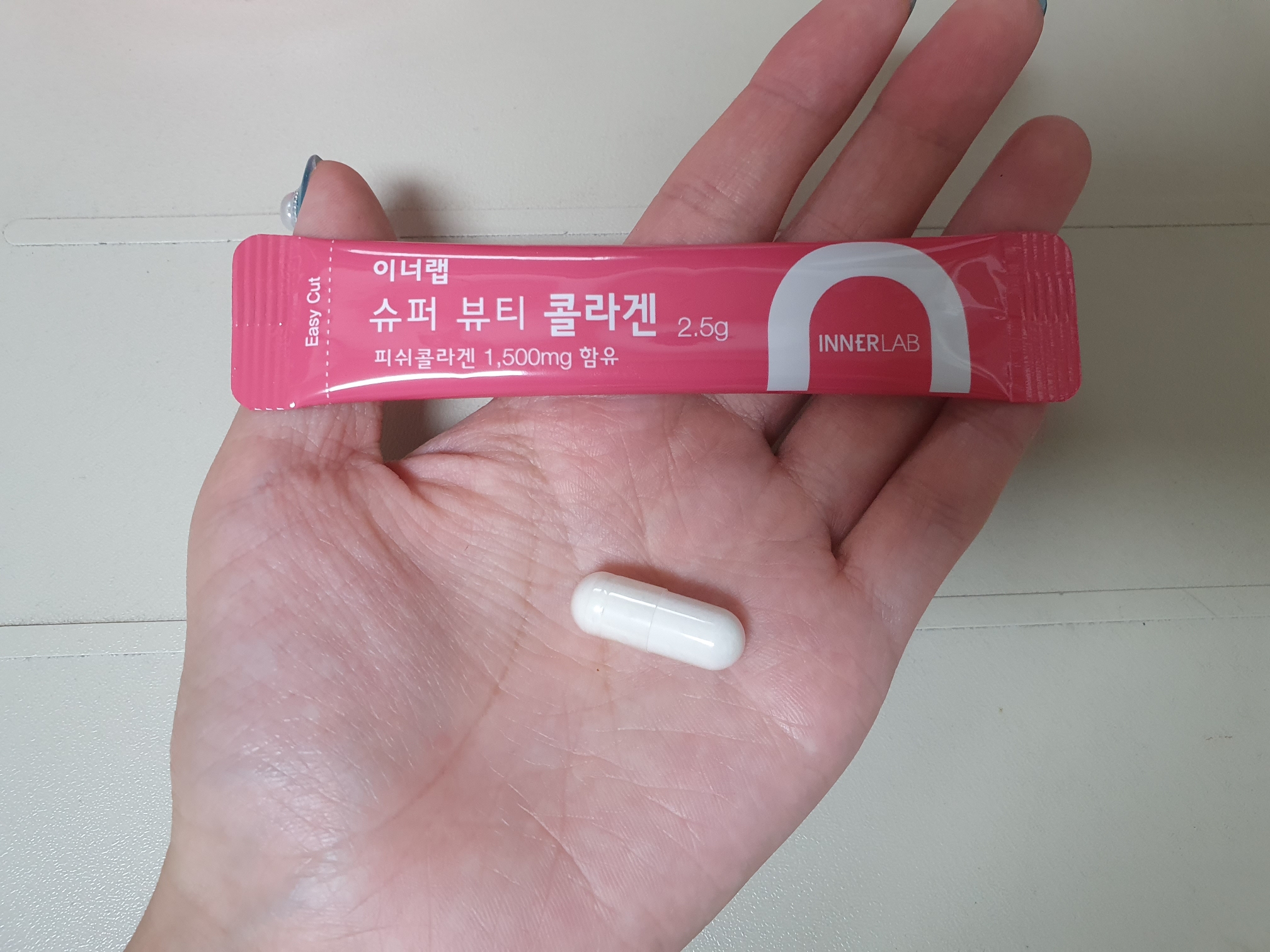 파우더타입의 이너랩 슈퍼 뷰티 콜라겐은 피쉬콜라겐이 60% 함유되어 있고 파우치에 담겨있다보니 가방에 쏙 넣고 다니다가 회사에서 먹기도 편리해요. 네오셀은 콜라겐이 2g정도 들어있고 캡슐이 크지 않아서 목에 걸리지 않고 편하게 먹을 수 있어요.