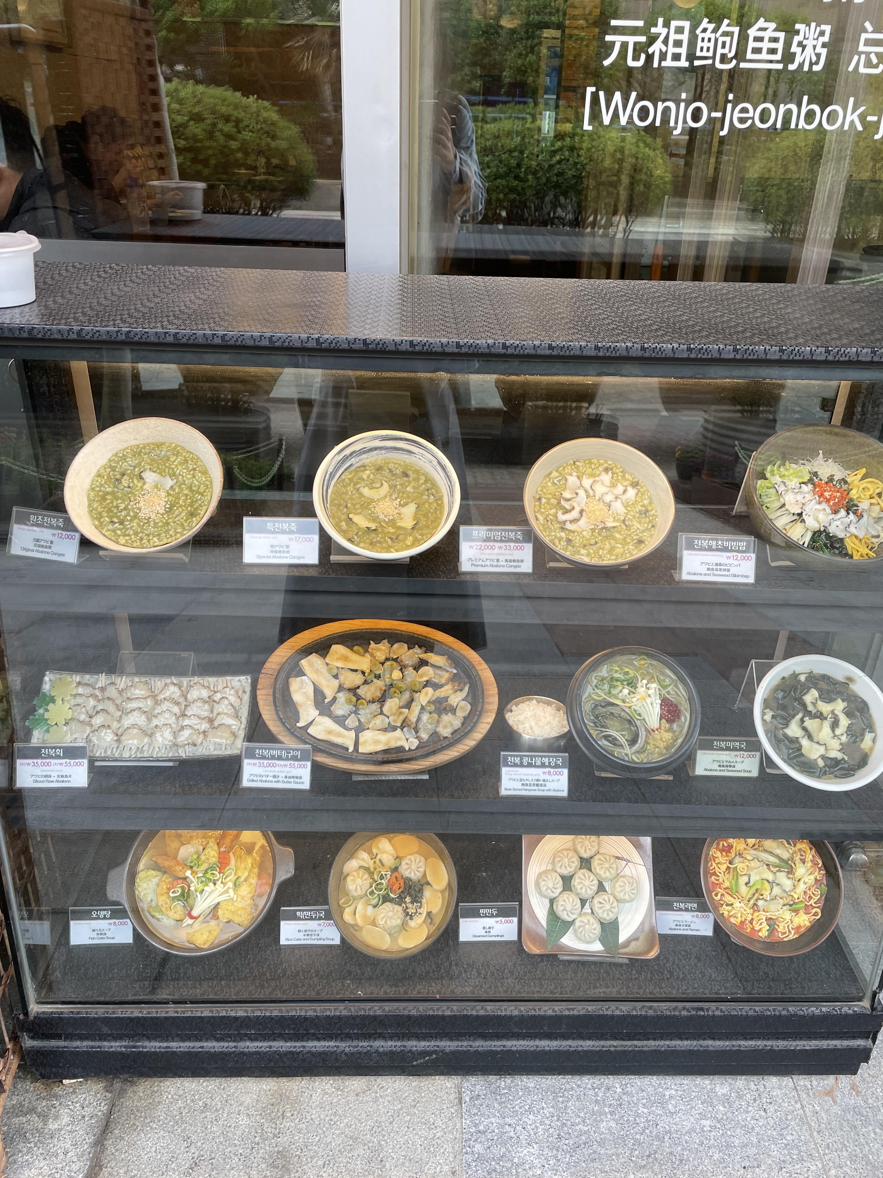 원조 전복죽 앞에 매뉴 모형들이 있는데 전복죽 뿐만 아니라 다양한 메뉴들이 판매되는 것을 볼 수 있다.