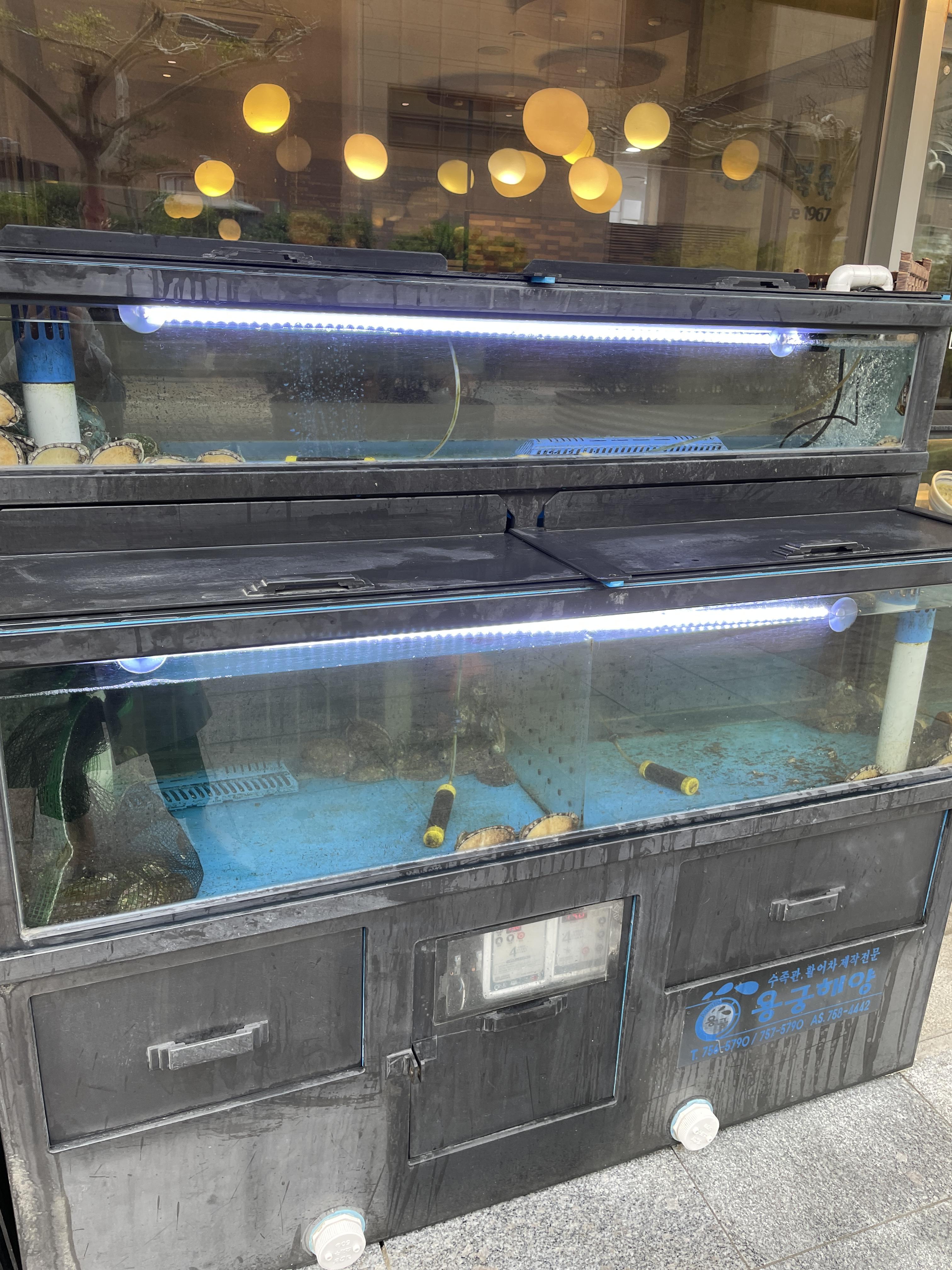 식당 앞에는 싱싱한 전복들이 들어있는 수조가 있다.
