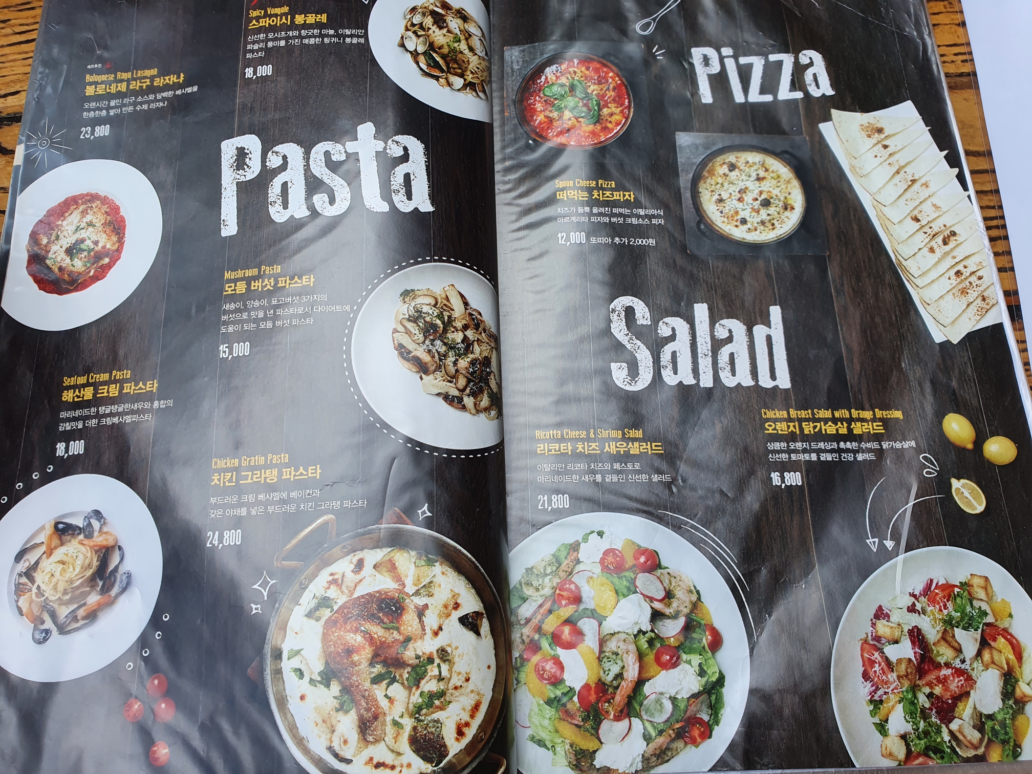 메뉴가 굉장히 다양한데, 이때 시간이 다섯시 정도라 이른 저녁을 먹는게 좋을 것 같아서 떠먹는 피자와 라자냐, 그리고 블랑, 하이볼을 주문했어요.