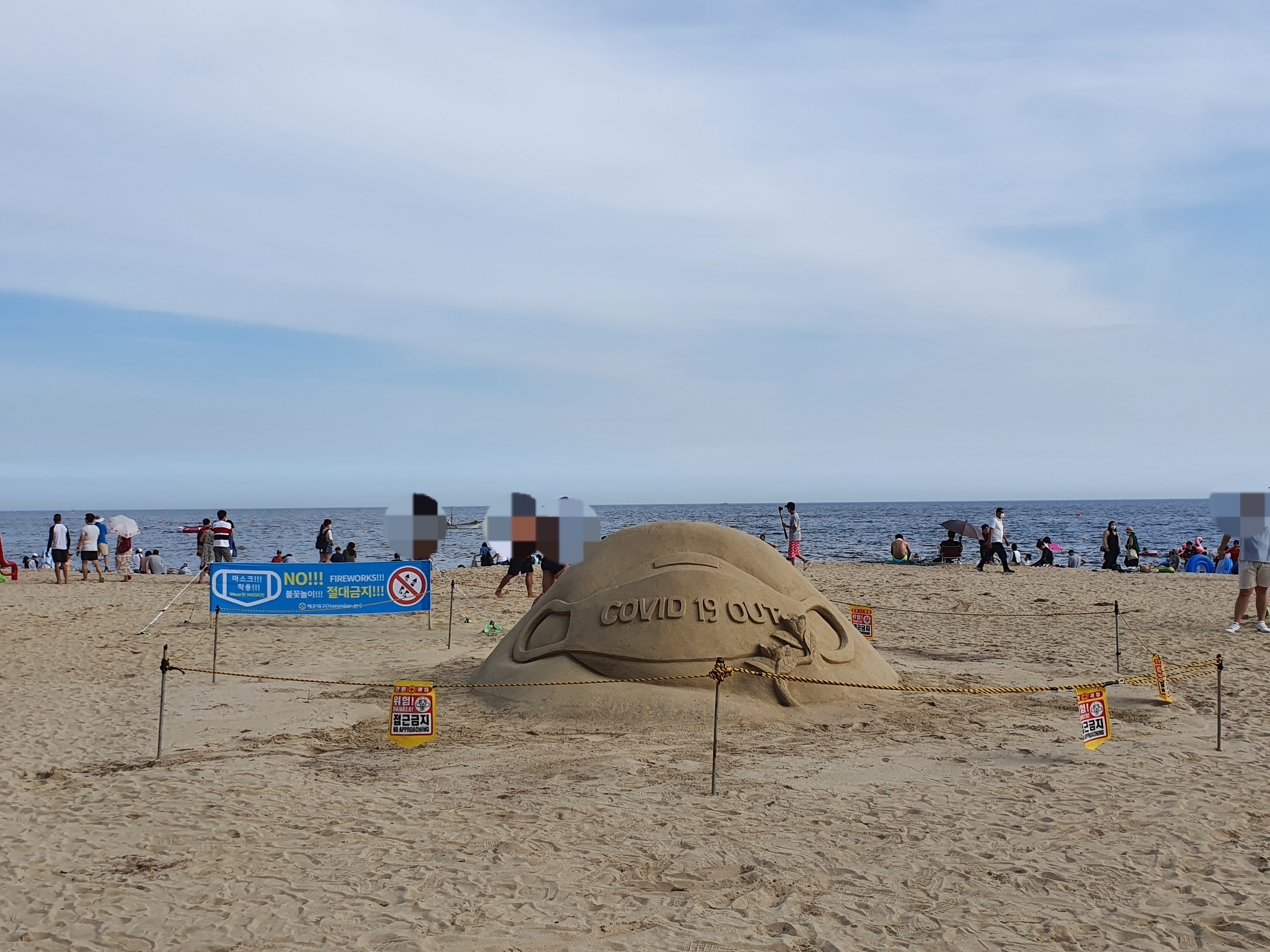 저는 걷는걸 좋아해서 해운대 해변가를 따라 걸었는데요, 모래로 예술작품을 만들어 놓았어요. 코비드19 아웃!! 마스크 모양이랑 글자가 잘 표현되어 있어서 그런지 마스크 쓰고 요 앞에서 사진 찍는 사람들이 많더라구요.