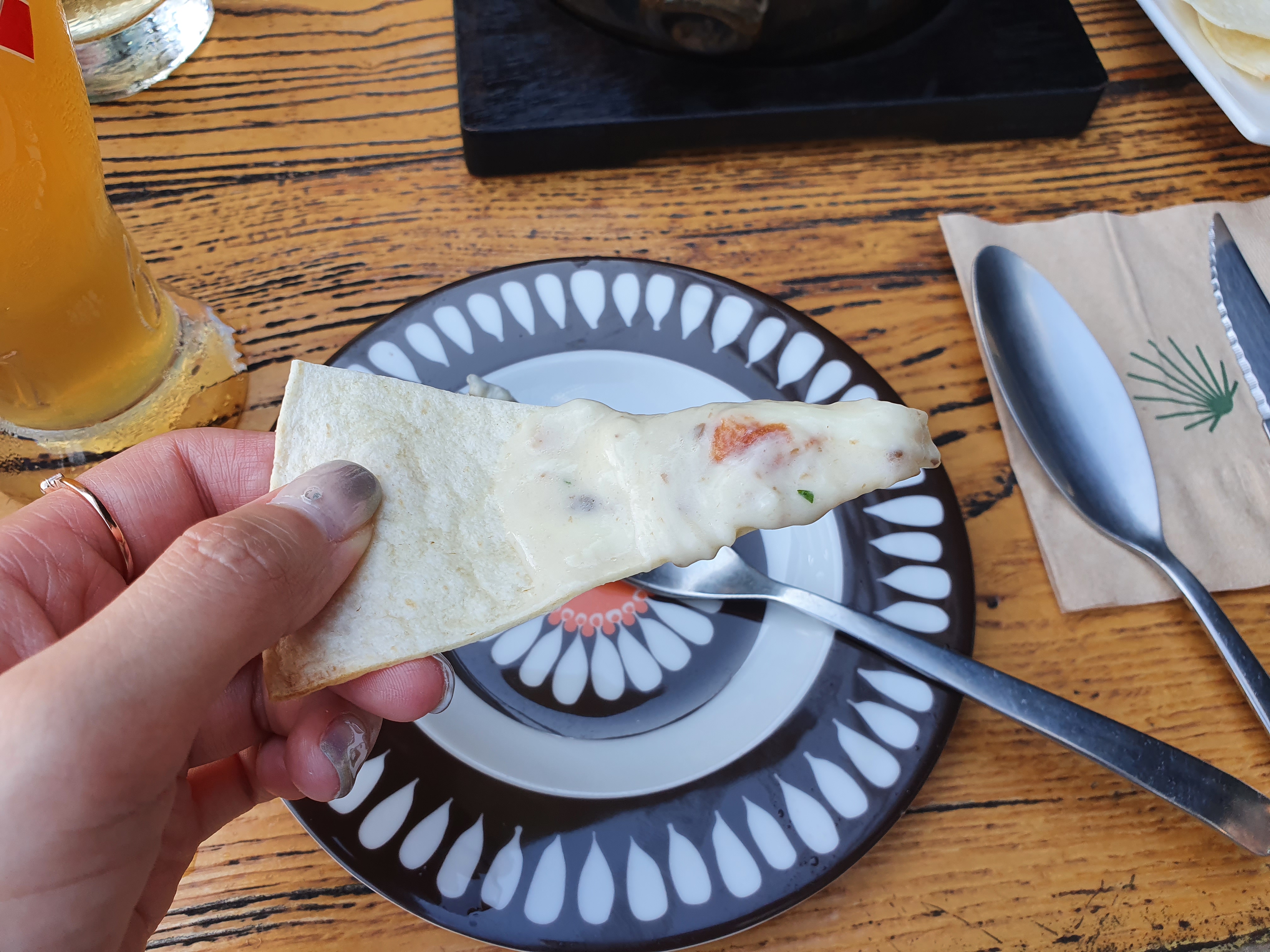 짠~ 주문한 떠먹는 피자가 나왔어요. 퐁듀처럼 치즈가 녹아 있어서 또띠아에 얹어서 먹는 방식이에요. 맛있습니다!