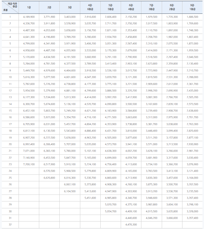 위의 표에서 보여지는 금액은 기본급으로, 여기서 제외된 수당은 정액급식비, 직급보조비, 초과근무수당 등 총 18가지 수당까지 포함한 금액을 연봉으로 보셔야 하고 매월 들어오는 급여는 상여금이 들어오는 달만 제외하고 거의 비슷하다고 보시면 됩니다.